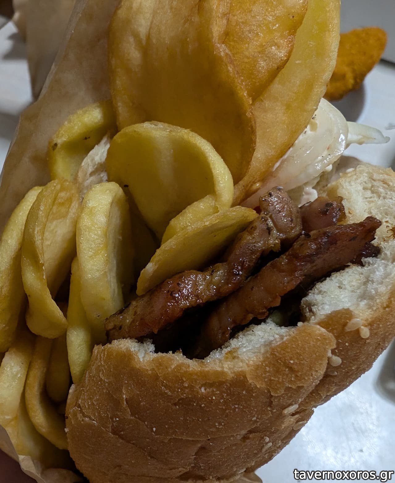 Το σουβλάκι δεν είχε λίπος αλλά ήταν ζουμερό και νόστιμο, η πίτα παντελώς αλάδωτη όπως μου αρέσει και οι πατάτες δεν μπόρεσα να καταλάβω αν ήταν προκάτ ή χεράτες (υποθέτω καλό είναι αυτό). Η αλοιφή εμπορίου.
