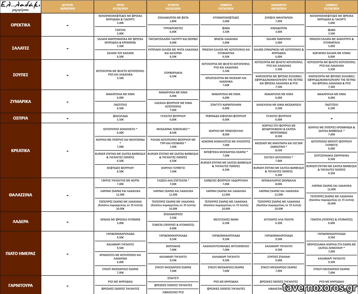 | Λέξεις κλειδιά | Ελλαδάκι, #πατσάς, #ντοματοκεφτέδες, #κολοκυθοκεφτέδες, #κοτόσουπα, #βραστό, #ψαρόσουπα, #παστίτσιο, #φασολάδα, #ρεβυθάδα, #φασόλια γίγαντες, #κόκορας κρασάτος, #σουτζουκάκια σμυρνέικα, #γαύρος, #σαρδέλα, #μπακαλιάρος σκορδαλιά, #αγκινάρες, #γεμιστά, #λαχανοντολμάδες, #μουσακάς, #κοκκινιστό, #μοσχαράκι λεμονάτο |