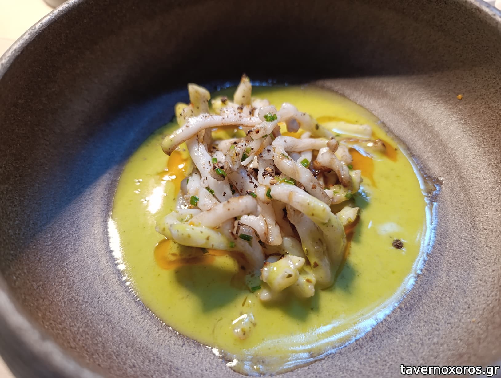 "Καλαμάρι: παστινάκι/ chutney chorizo/ σέσκουλα/ vinaigrette από πράσινο πιπέρι τουρσί"