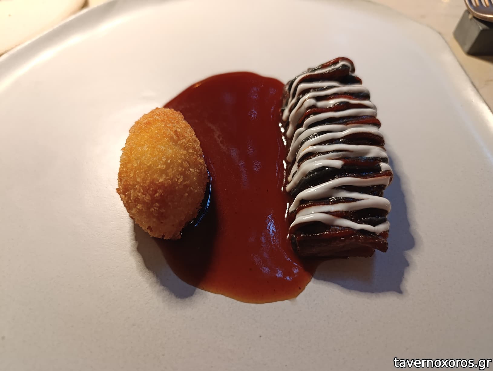 "Μοσχαρίσια στηθοπλευρά: μελιτζάνα/ γιαούρτι/πιπεριά Φλωρίνης/ τραγανή πολέντα/ σάλτσα πιπεριού"