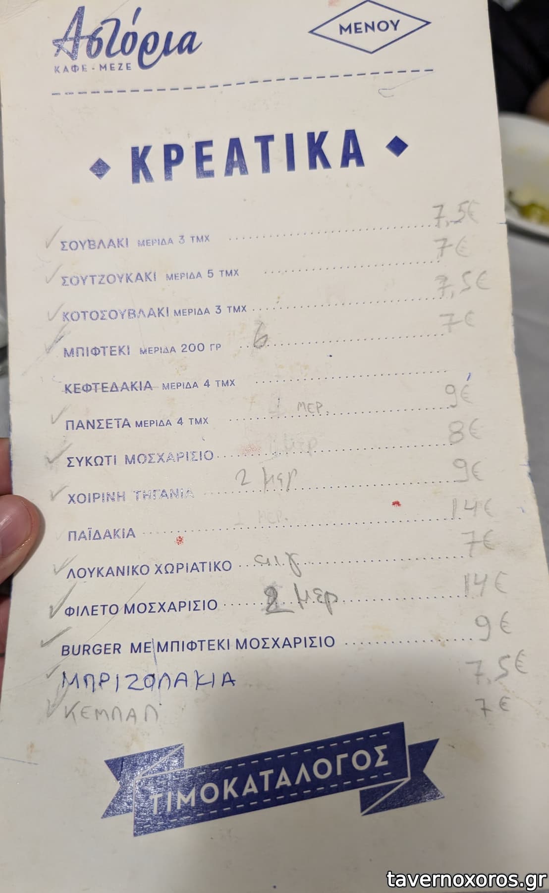 Από φαγητό καλές εντυπώσεις: συκώτι τηγάνι πολύ δυνατό (κομμένο κομματάκια), μπιφτέκι που είπαν ότι είχε και αρνίσιο κιμά, καλό. Χοιρινή τηγανιά οκ (είχε πολλά λίπη), πιπεριές πράσινες μπακάλικες τηγάνι οκ.