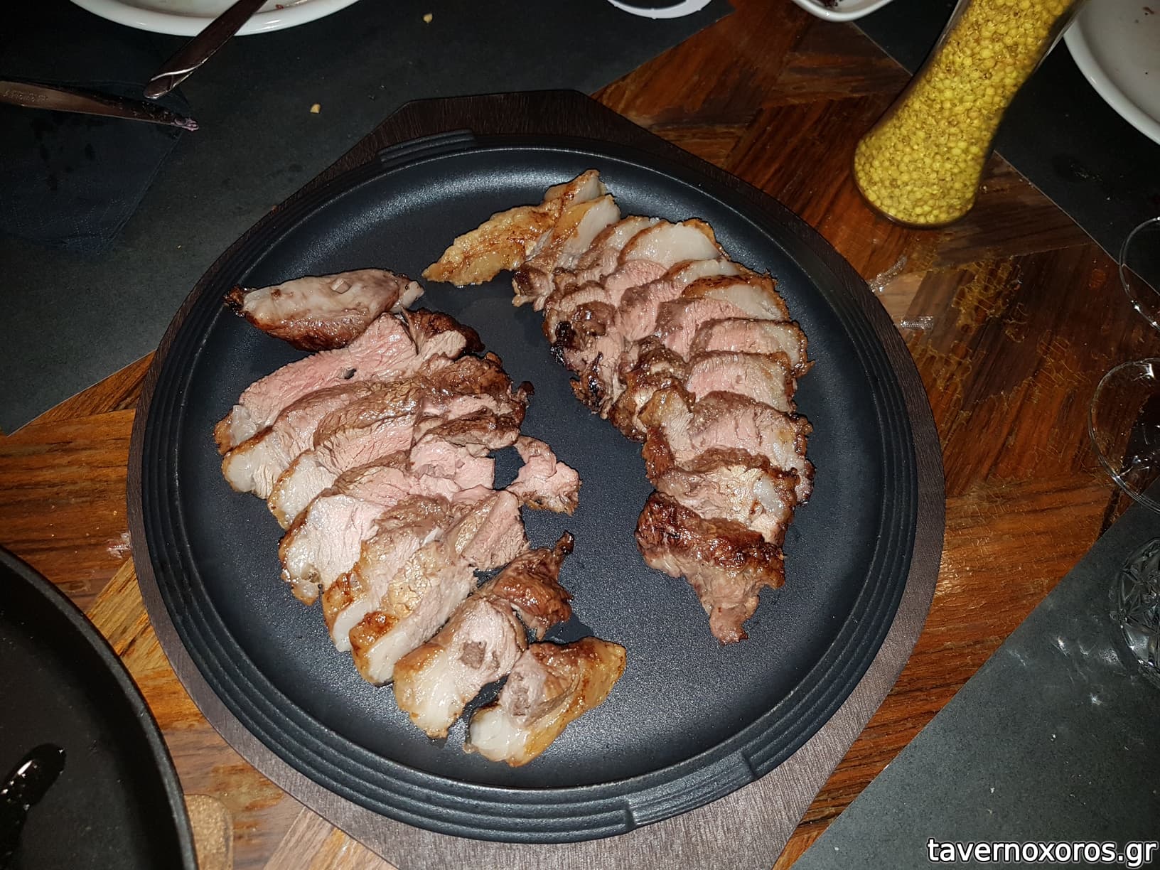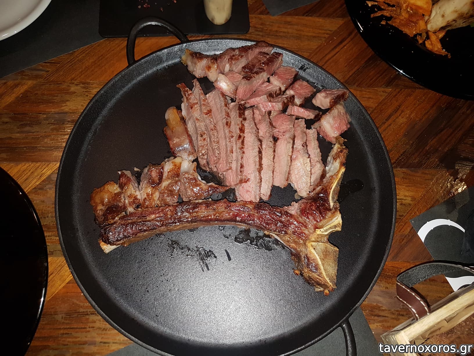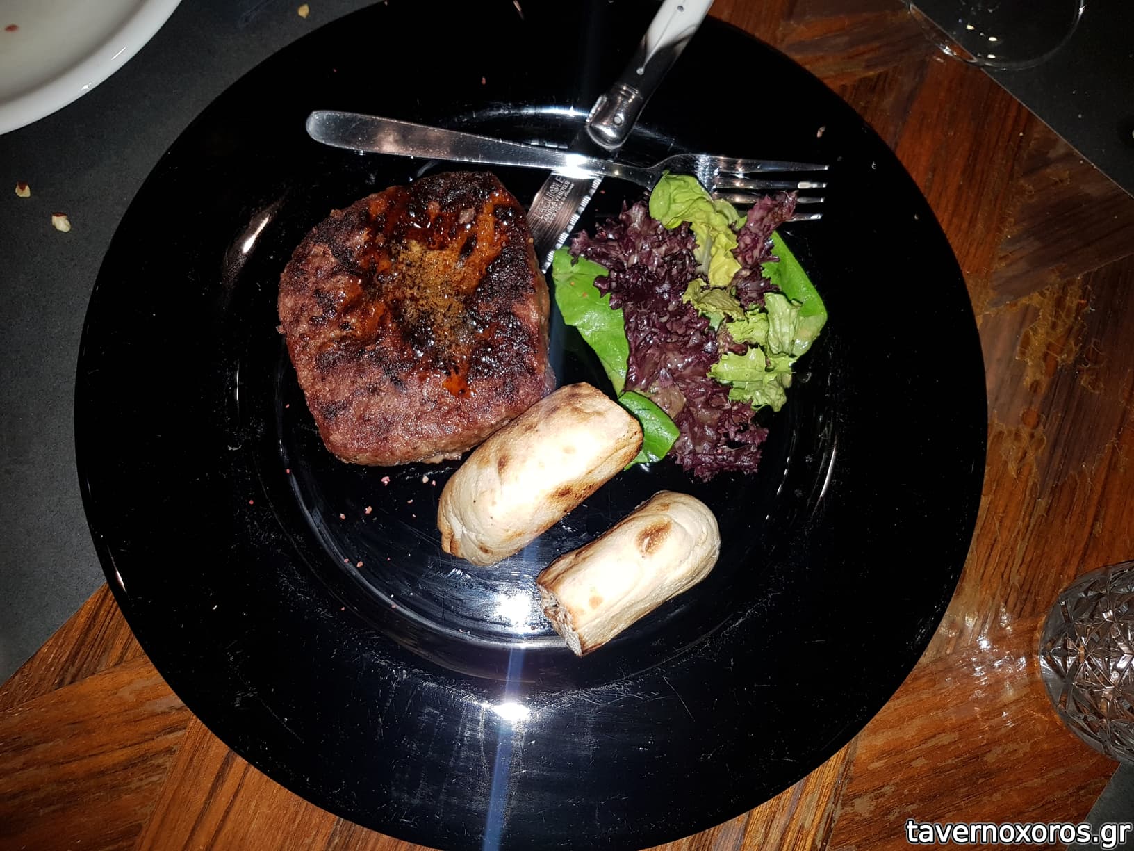 "Αφράτο μπιφτέκι από μοσχίδα Παρανεστίου Δράμας" (άρεσε πολύ σε όλη την παρέα, σε μένα όχι τόσο γιατί δεν είμαι πολύ φαν του ελληνικού στυλ μπιφτεκιού)