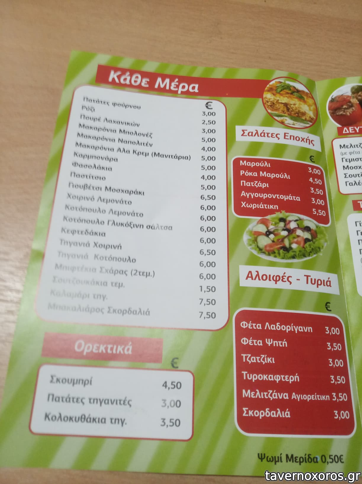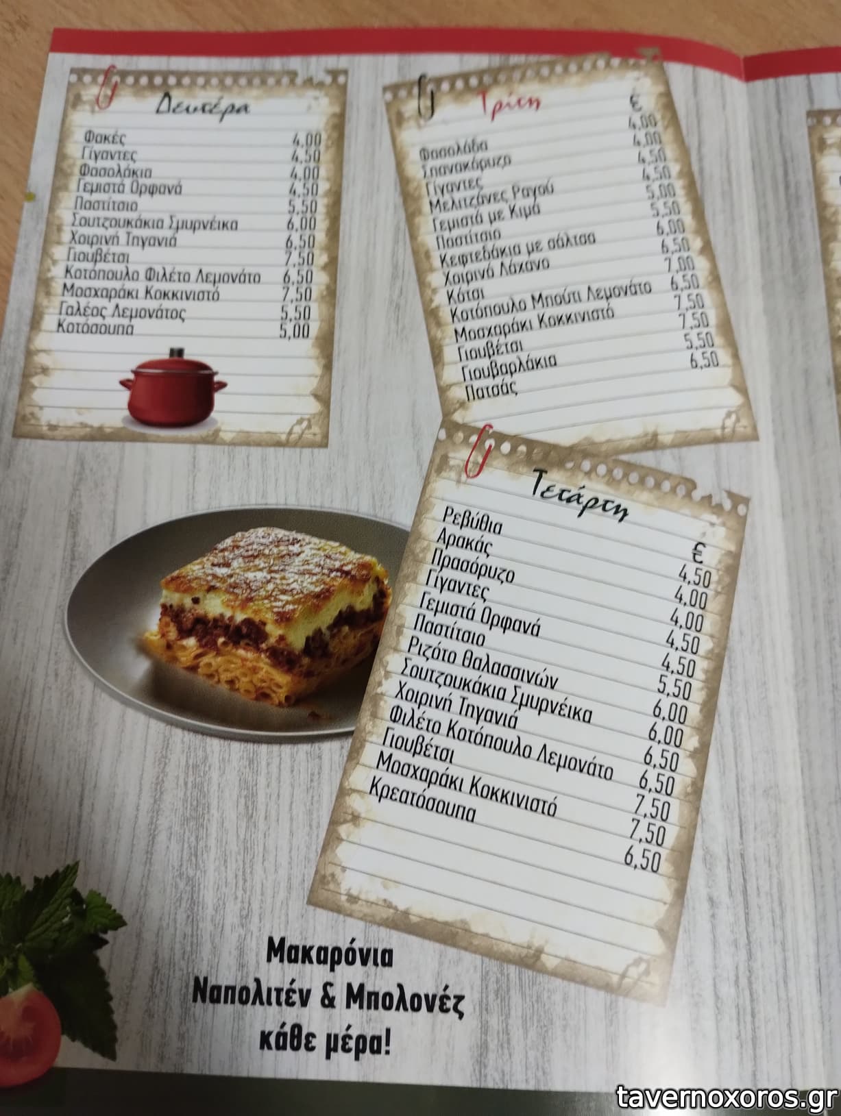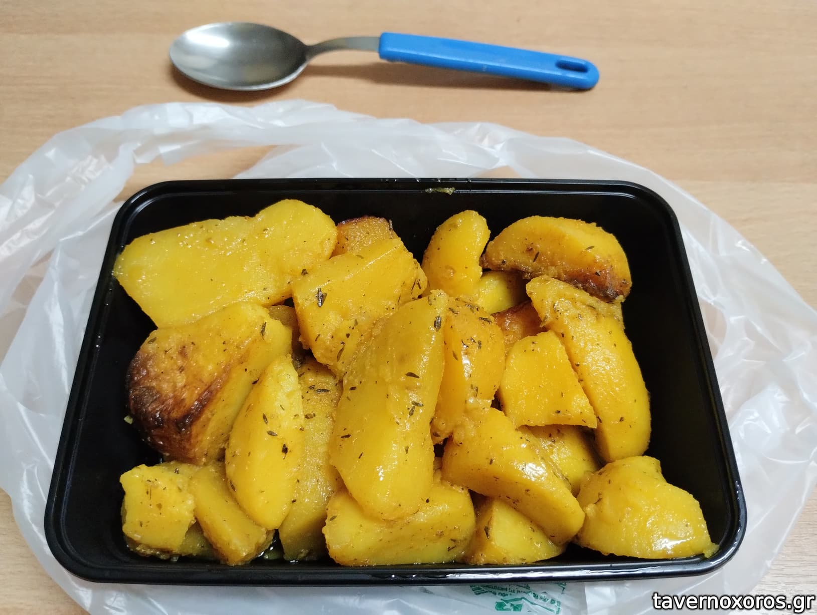 Τέλος και το σταθερό μενού. Πλέον όπως πολλά άλλα μαγαζιά του είδους, έχουν στάνταρ πρόγραμμα για κάθε μέρα της εβδομάδας. Τελικά πήρα τις πατάτες φούρνου, που αν είναι καλομαγειρεμένες, βάζουν κάτω πολλά άλλα φαγητά. Όπως γράφω και στη φωτό, μού αρέσει και το χρώμα, που μού θυμίζει μπαχάρια (κουρκουμά, μουστάρδα κτλ.) 3ε.
