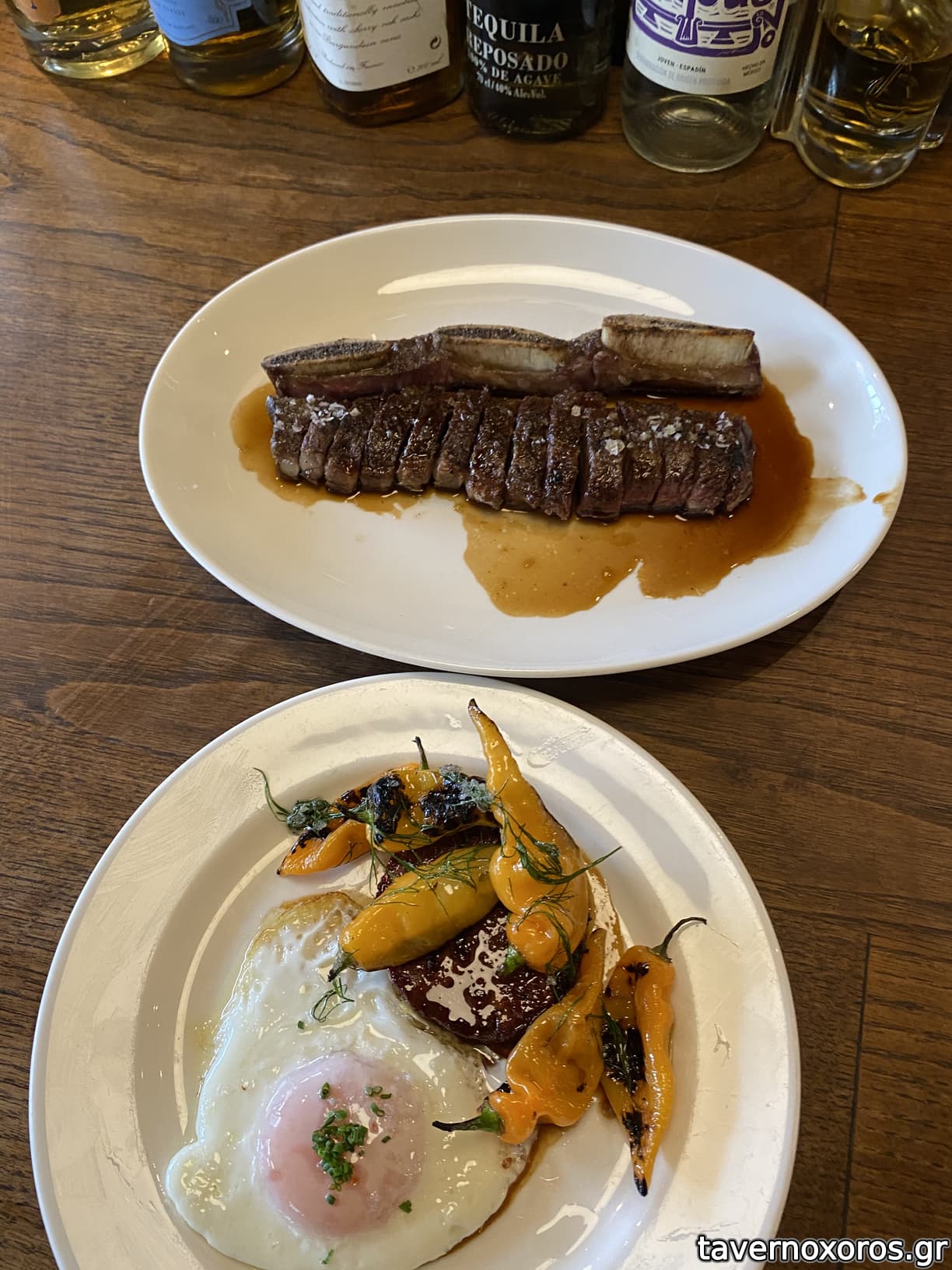 Αυγό με λουκάνικο και πιπεριές και βοδινό παΐδι