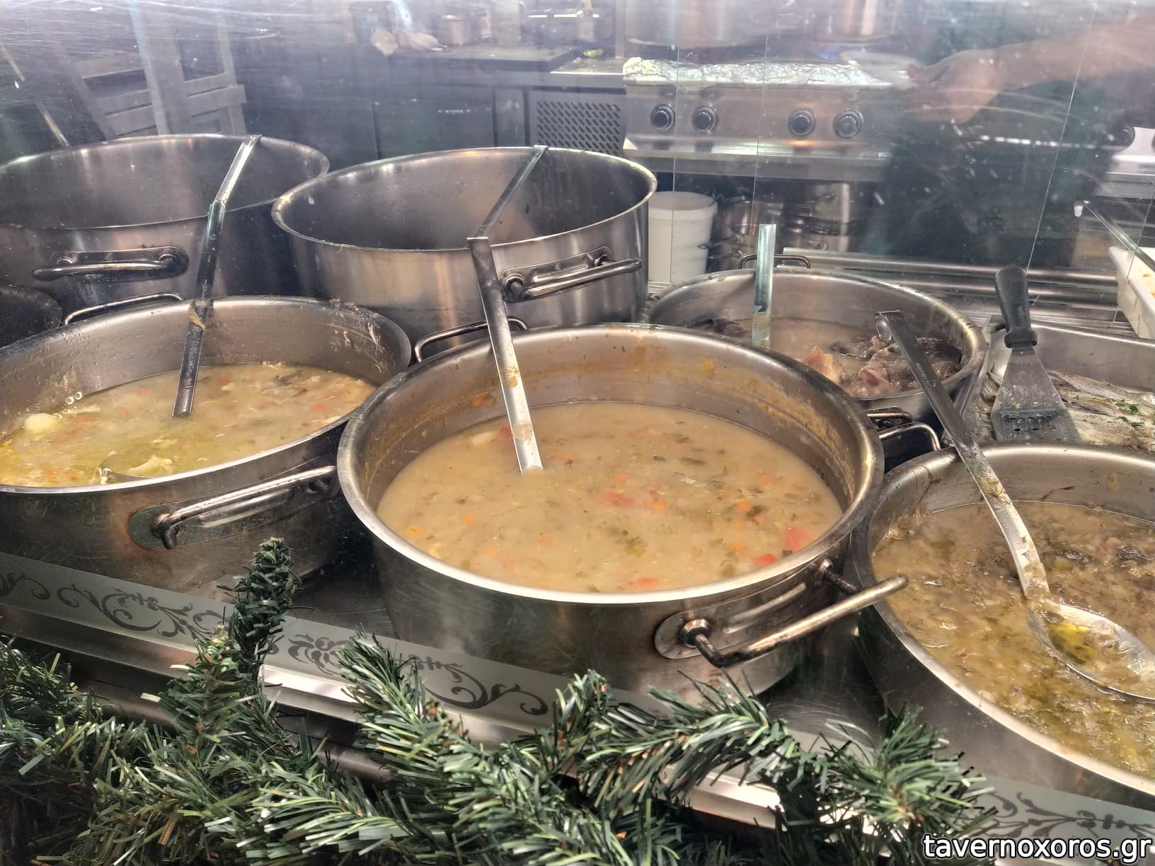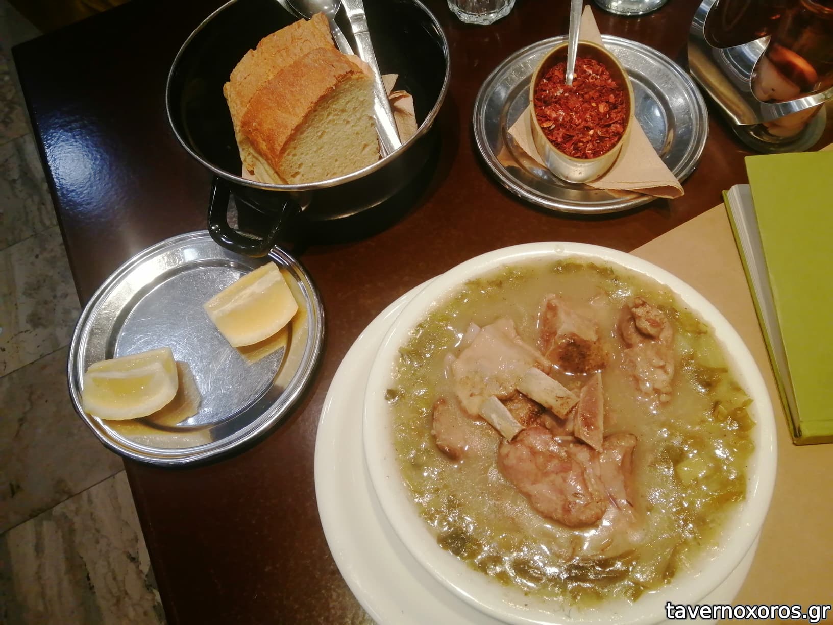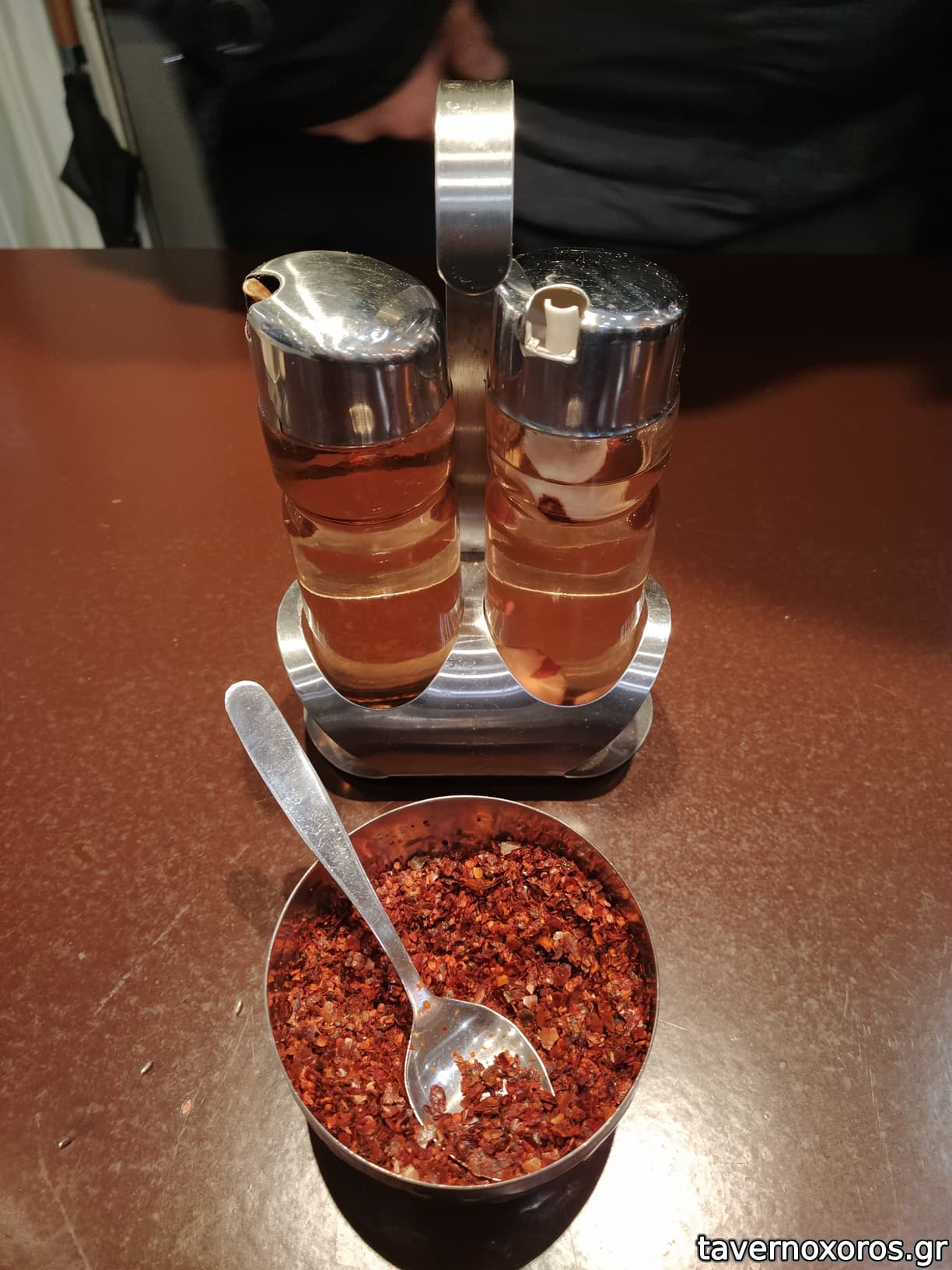 Στο τραπέζι βρίσκουμε αλάτι, πιπέρι, ξύδι με ολόκληρα σκόρδα εντός, αλλά και ξύδι σκέτο.