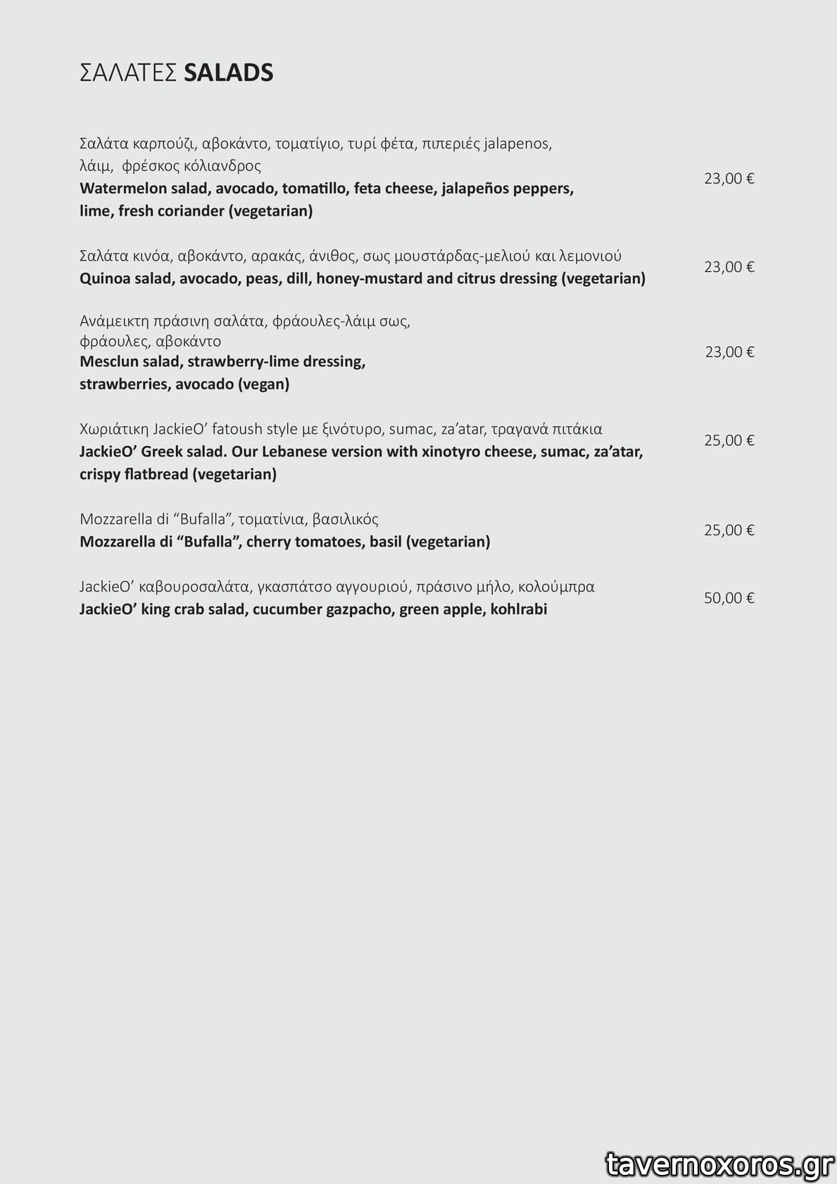 | Λέξεις κλειδιά | Τζάκι, Tzaki, Jackie O, #beach bar, #ξαπλώστρες, #αχινοσαλάτα, #sashimi, #αυγοτάραχο, #χταπόδι, #καβουροσαλάτα, #γαρίδες, #όστρακα, #χαβιάρι, #σολομός, #κεφτεδάκια, #κοτόπουλο, #αστακομακαρονάδα, #wagyu, #καβούρια, #τόνος, #ντολμαδάκια, #ζυμαρικά |