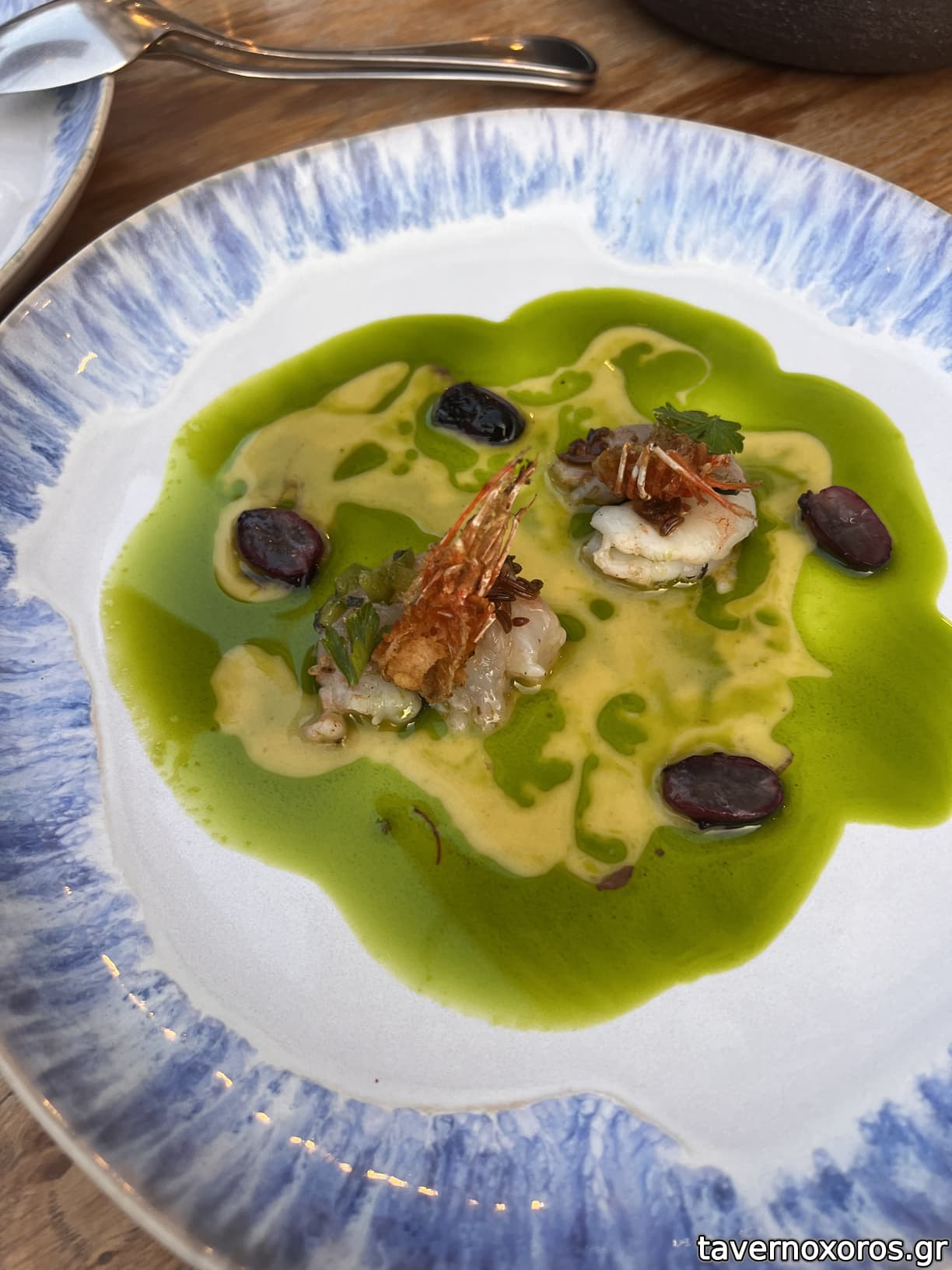 Γαρίδες από τον Πετριτή ωμές ελαφρά καπνισμένες, βούτυρο αρωματισμένο με σύγκλινο, μαραθόσπορος, σταφύλια, χυμός καυτερής πράσινης πιπεριάς, αντράκλα