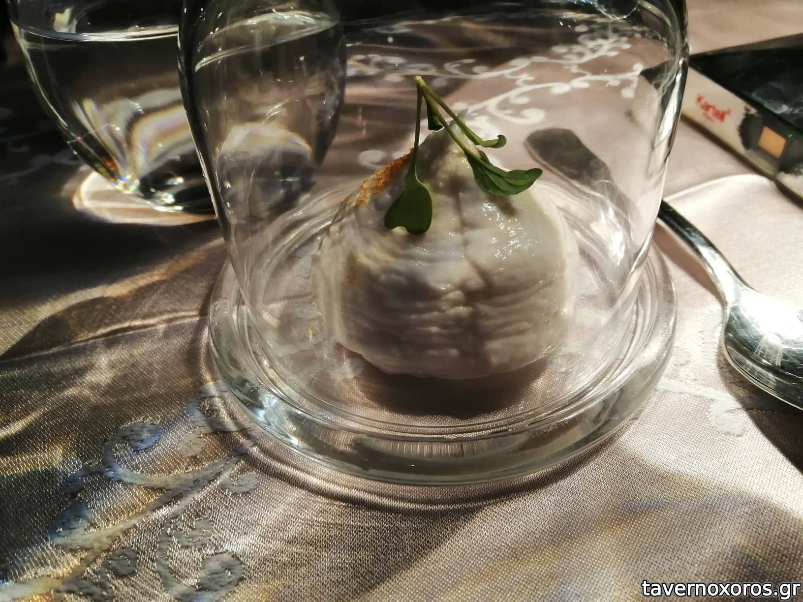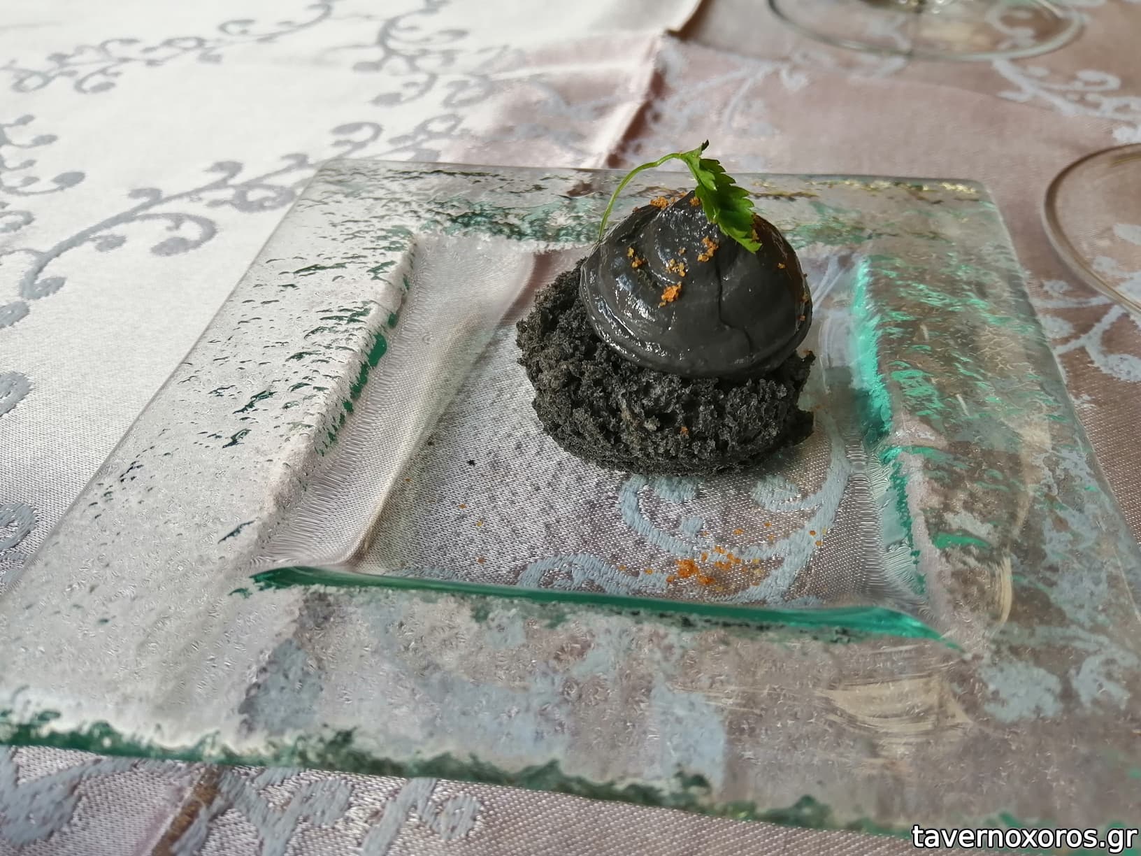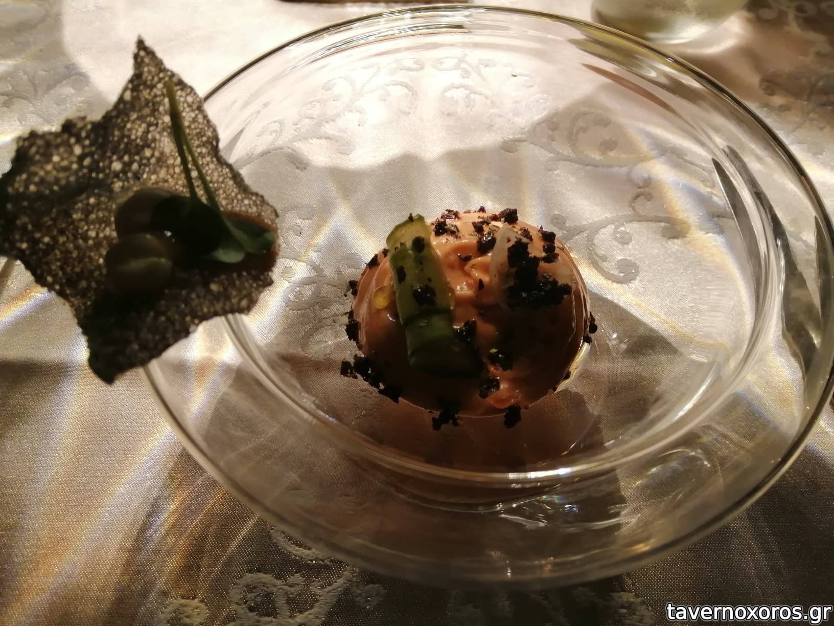 Πιάτο 2: ταρτάρ μπαρμπούνι/ χώμα χαρουπιού/ γαλάκτωμα σκουμπρί/ εσπεριδοειδή