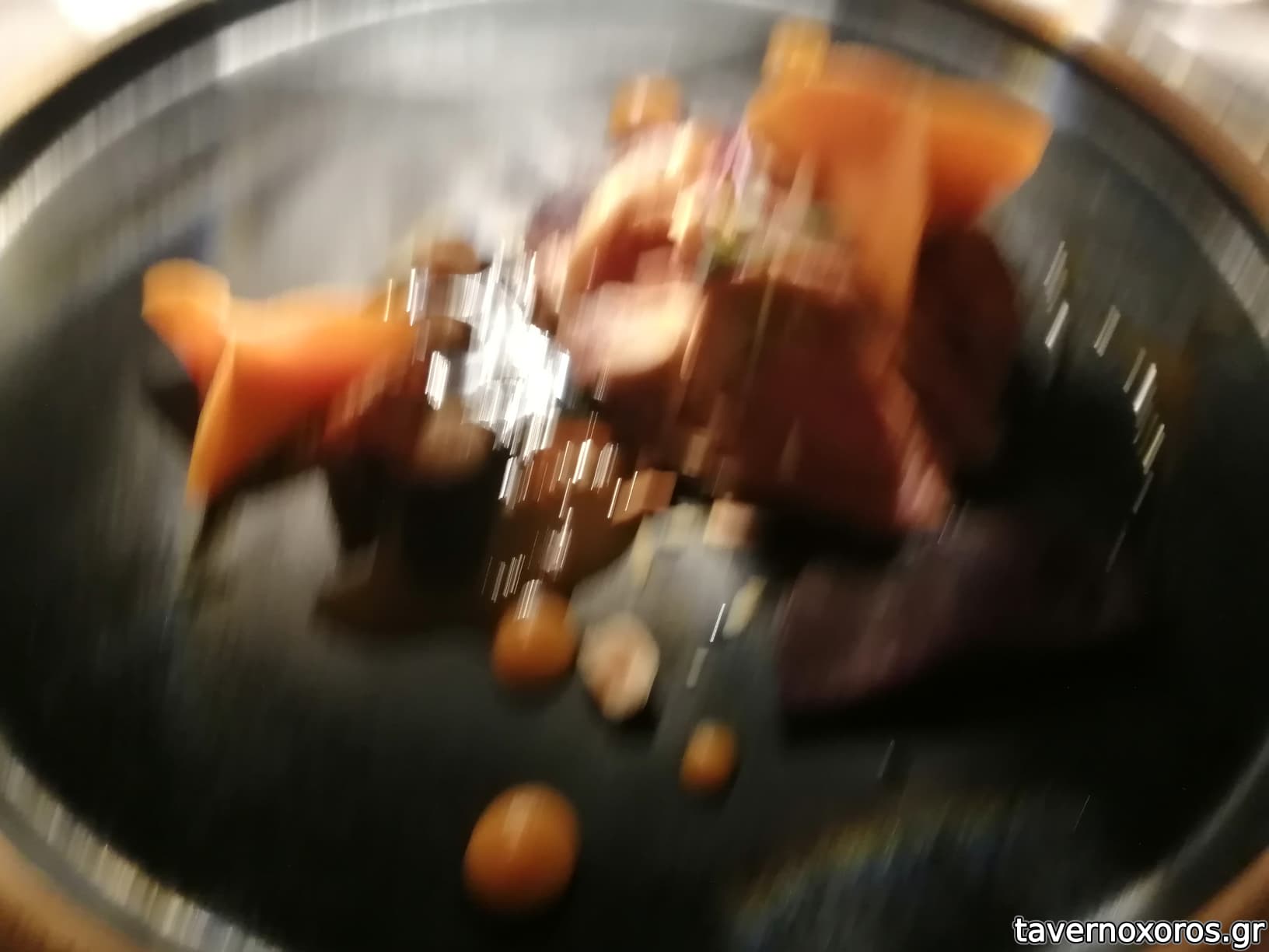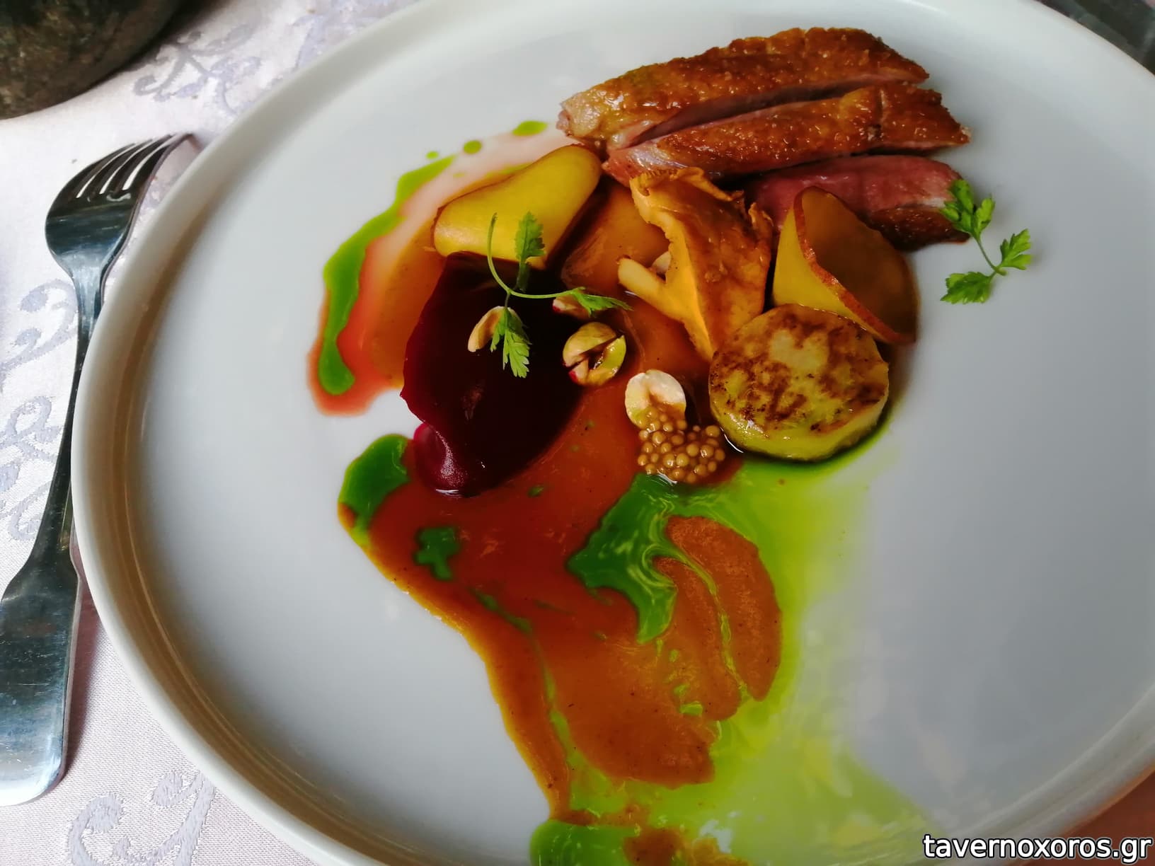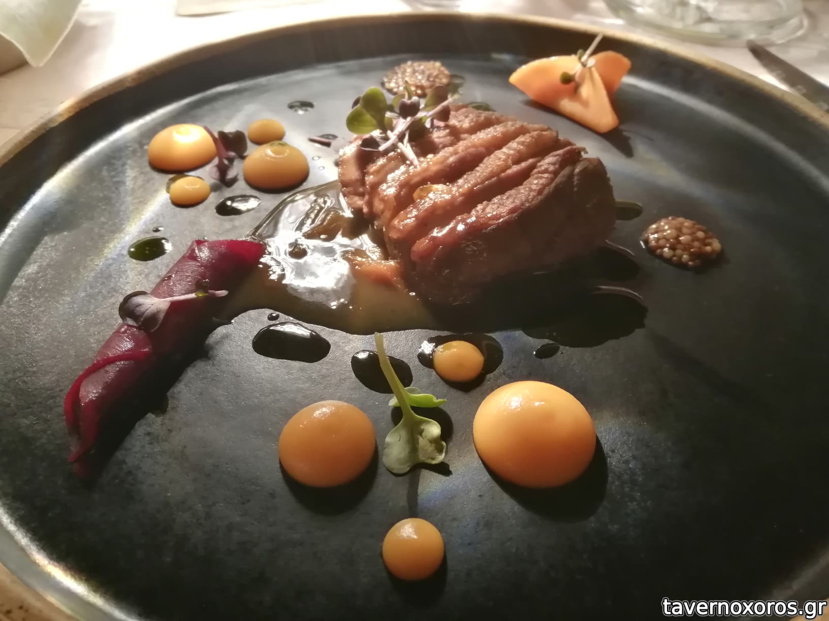 Πιάτο 4: στήθος πάπιας, γλυκιά κολοκύθα, τουρσί κανθαρέλες, σινάπι σε ζύμωση, κουμκουάτ