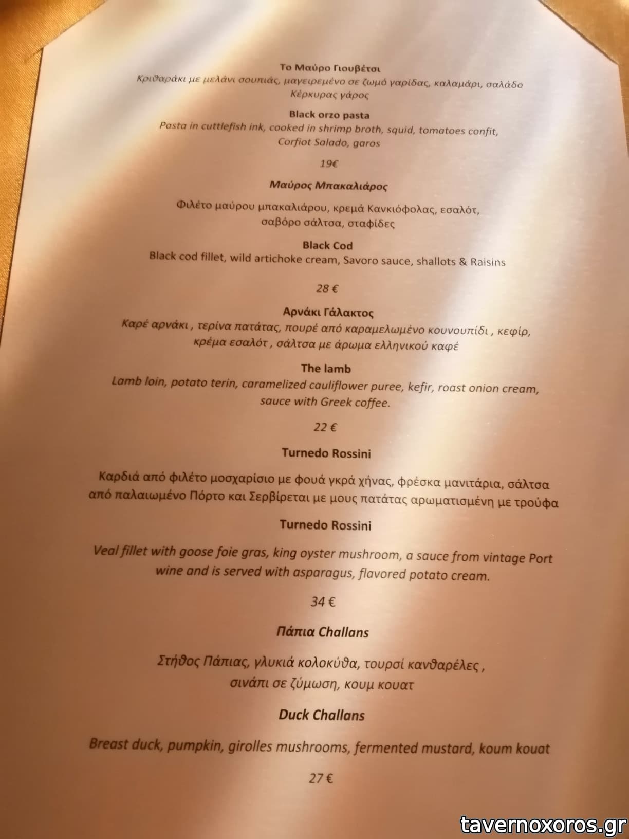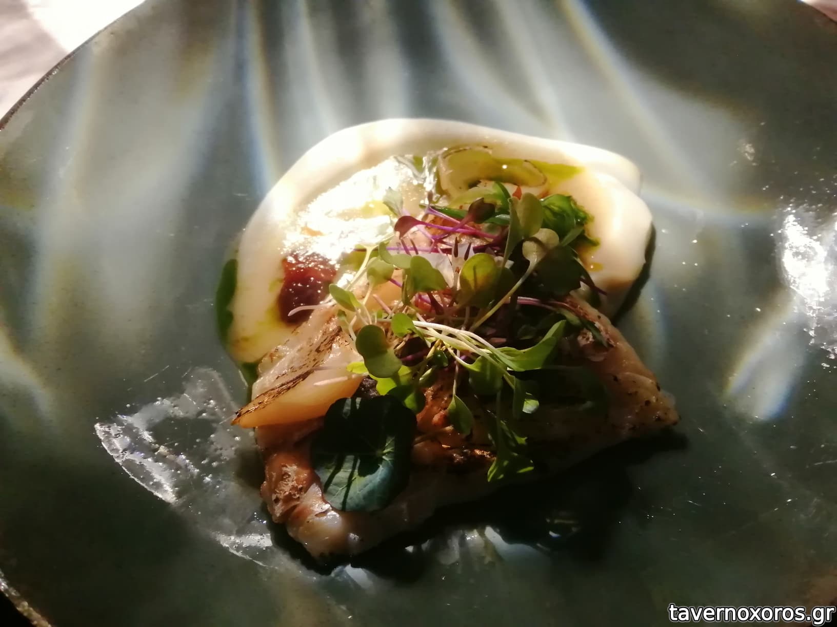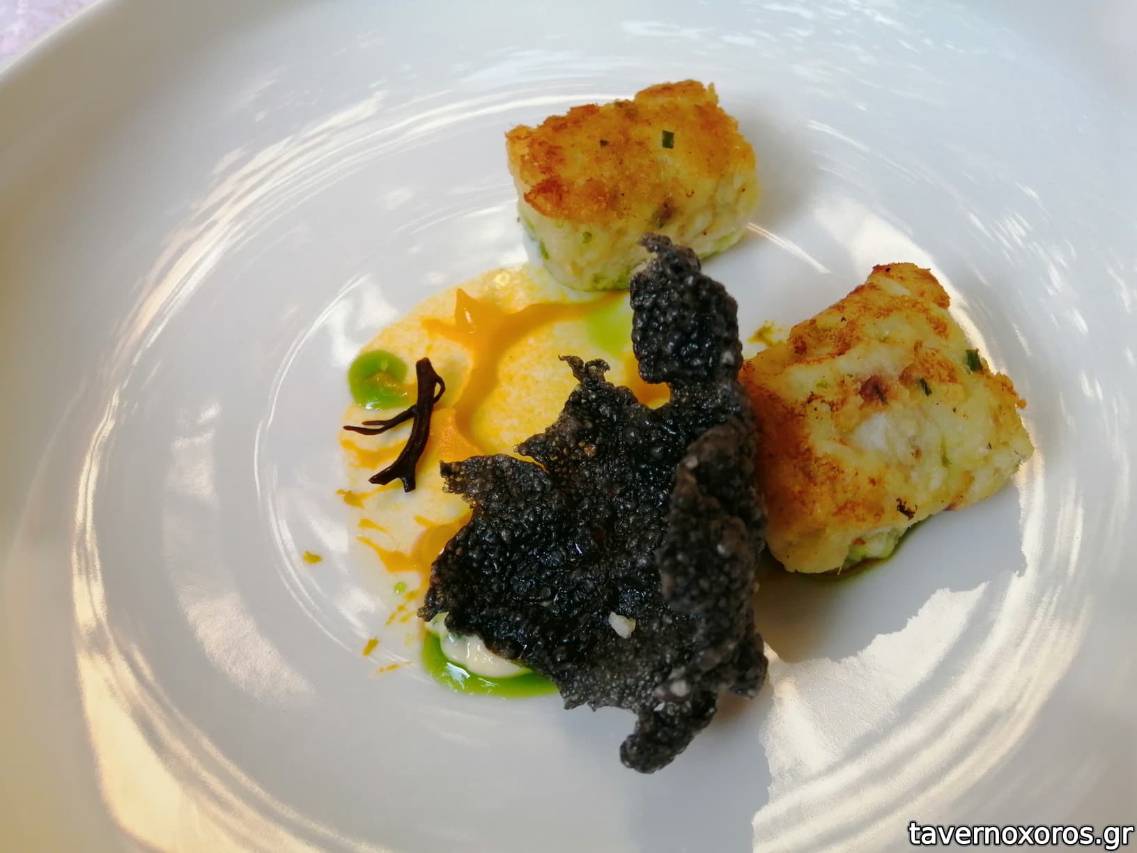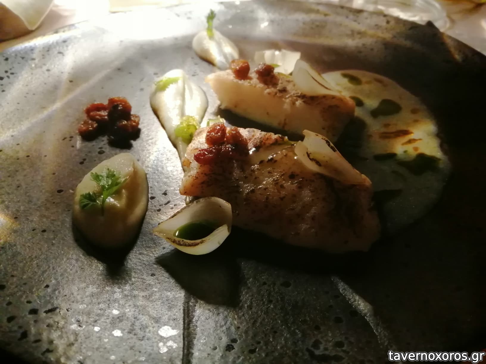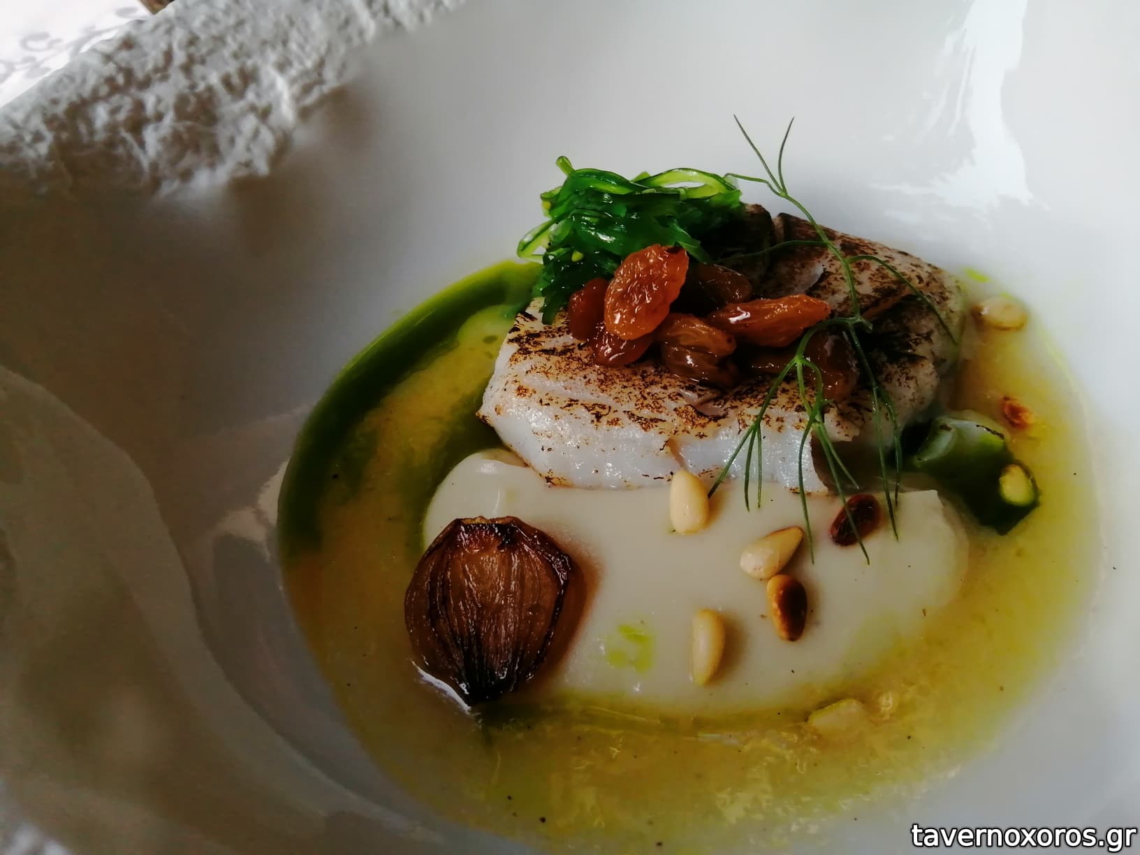 Πιάτο 3: φιλέτο μαύρου μπακαλιάρου, κρέμα κανκιόφολας, εσαλότ, σαβόρο σάλτσα, σταφίδες