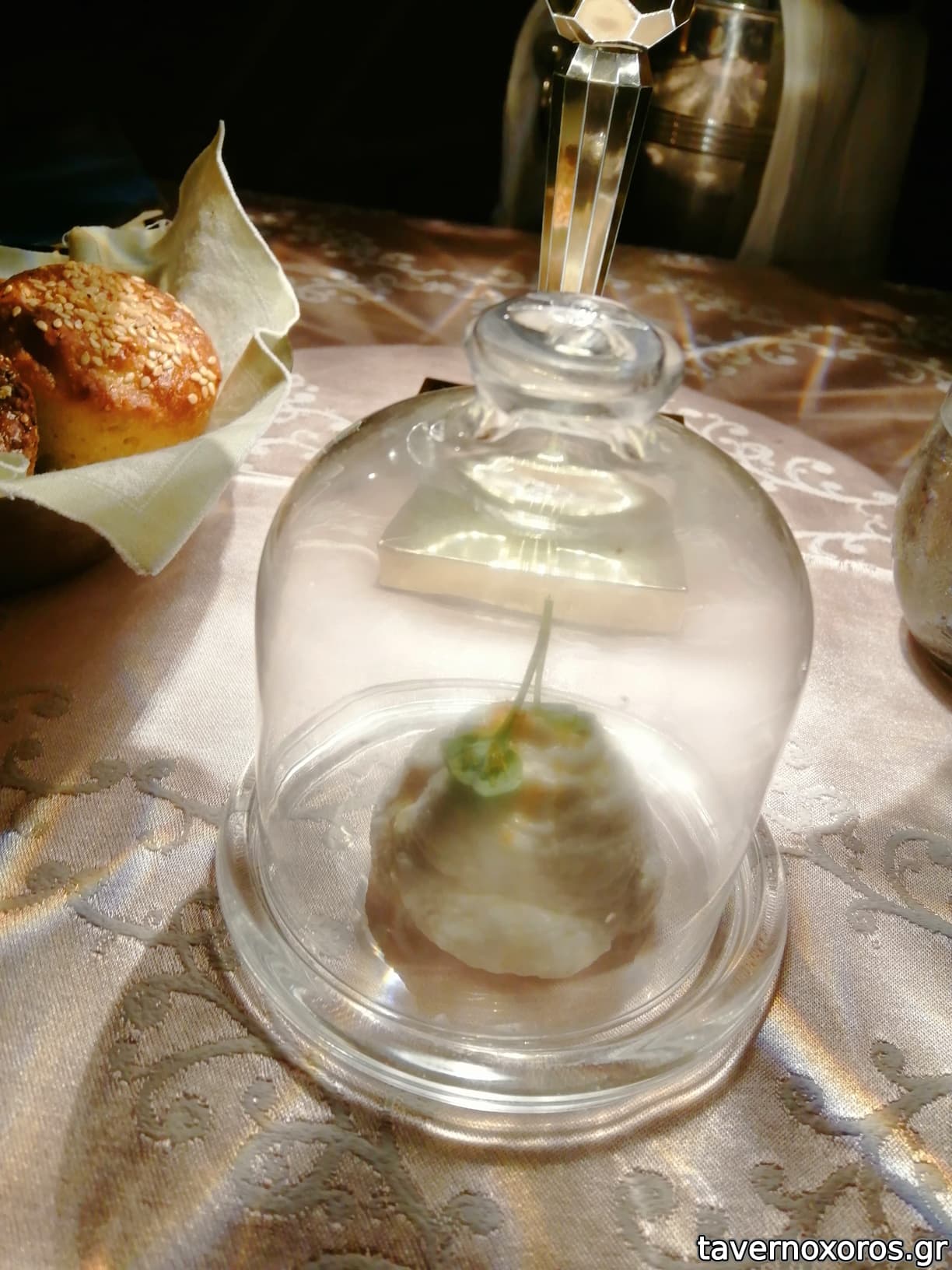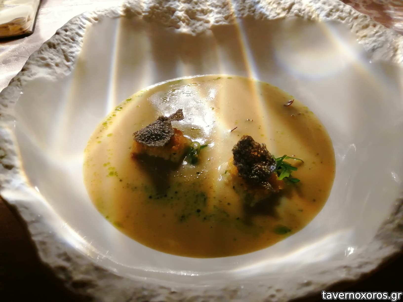 Πιάτο 1: βελουτέ κακαβιάς, νιόκι από πετρόψαρα, αχινός, σαμπούκο