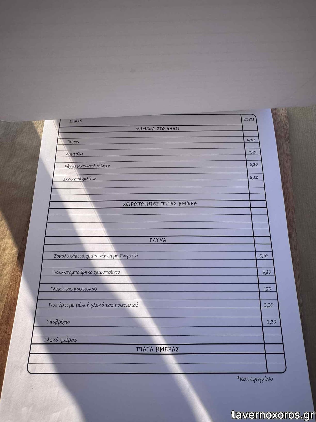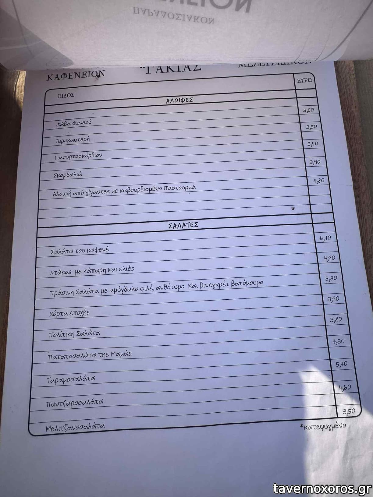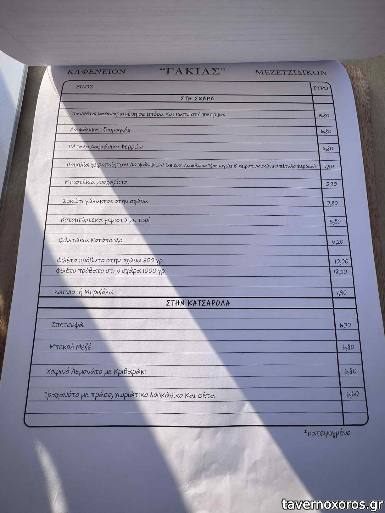 | Λέξεις κλειδιά | #αυλή, #κεφτεδάκια, #τηγανιά, #χταπόδι, #μύδια, #γαύρος, #γαρίδες, #θράψαλα, #γάμπαρη, #σαρδέλα, #μυδοπίλαφο, #γαύρος μαρινάτος, #ρέγγα, #φάβα, #παστουρμάς, #φασόλια γίγαντες, #ντάκος, #στραπατσάδα, #σουτζούκι, #μανιτάρια, #κολοκυθοκεφτέδες, #ντοματοκεφτέδες, #ντολμαδάκια, #μαστέλο, #πιπεριές, #ομελέτα, #καβουρμάς, #αυγά, #τυροπιτάρι, #σφακιανή πίτα, #σκιουφιχτά, #στάκα, #απάκι, #μετσοβόνε, #μελιτζάνες, #μοσχαράκι λεμονάτο, #συκώτι, #κοτόπουλο, #γλυκάδια, #συκωταριά, #μπιφτέκι, #πανσέτα, #λουκάνικο, #συκώτι τηγανητό, #πρόβειο, #χοιρινή, #σπεντζοφάι, #φιλετάκια προβατίνας, #μπεκρή μεζές, #χοιρινό κατσαρόλας, #λεμονάτο, #τραχανάς, #γιουβέτσι, #γαλακτομπούρεκο, #γλυκά του κουταλιού, #υποβρύχιο |