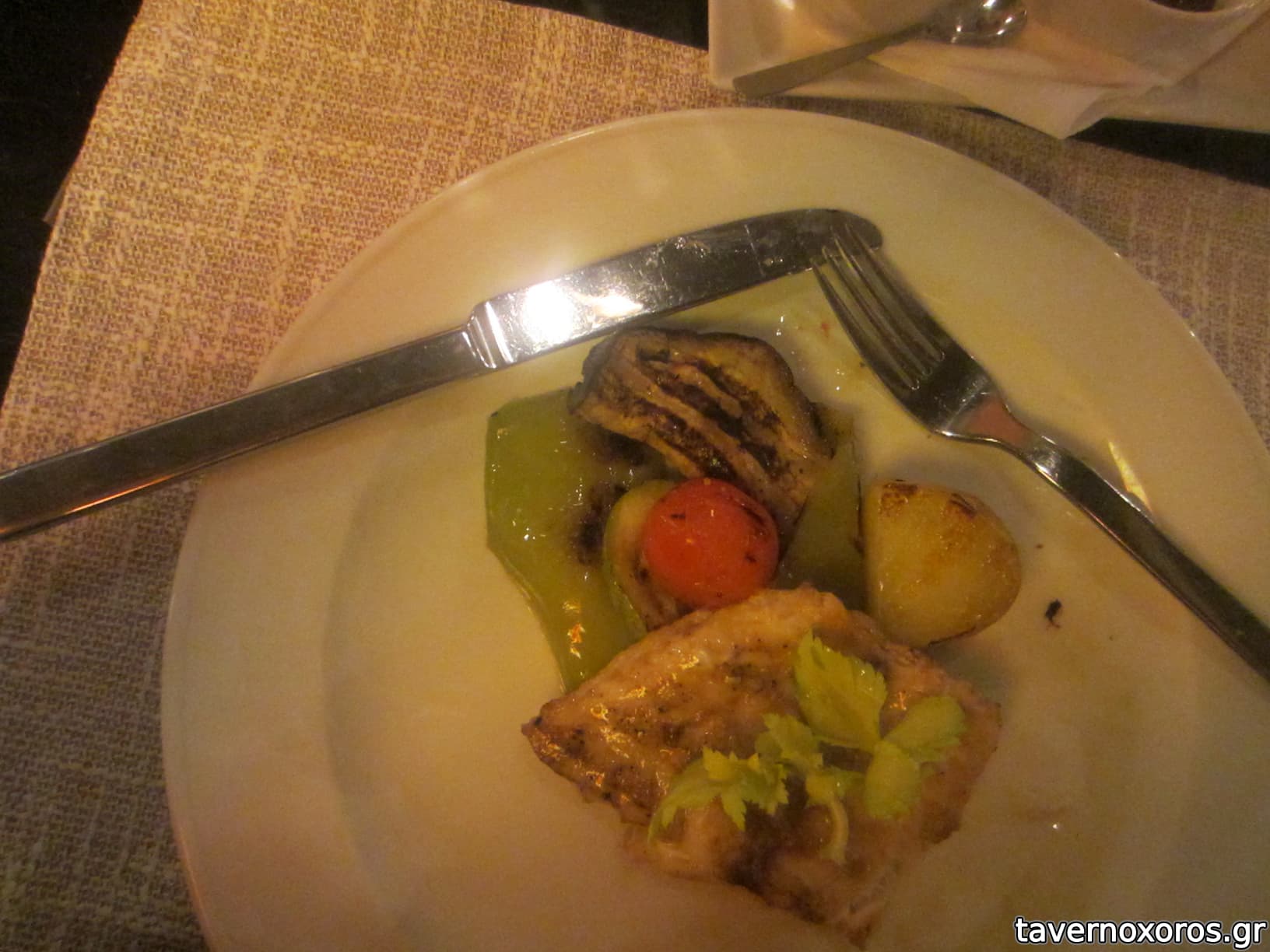 Σφυρίδα με λαχανικά σχάρας (η σφυρίδα νόστιμη, τα λαχανικά πολύ πολύ μέτρια, γελοία ποσότητα)