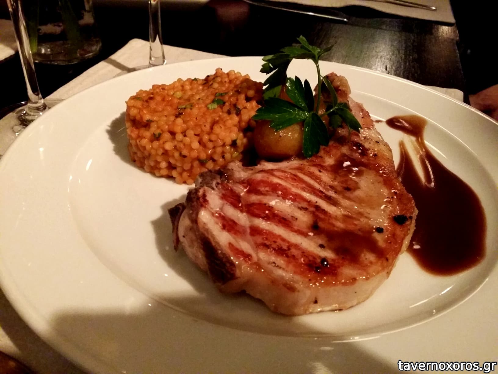 Pork steak με κους κους και καραμελωμένα κρεμμύδια (μέτριο)