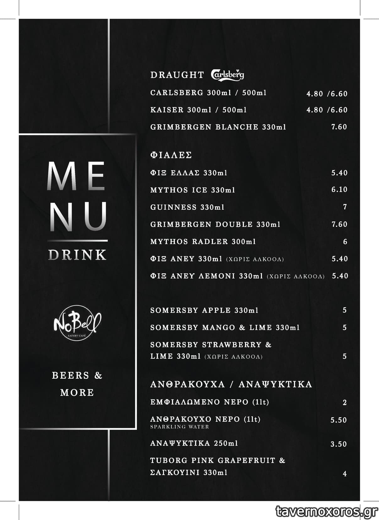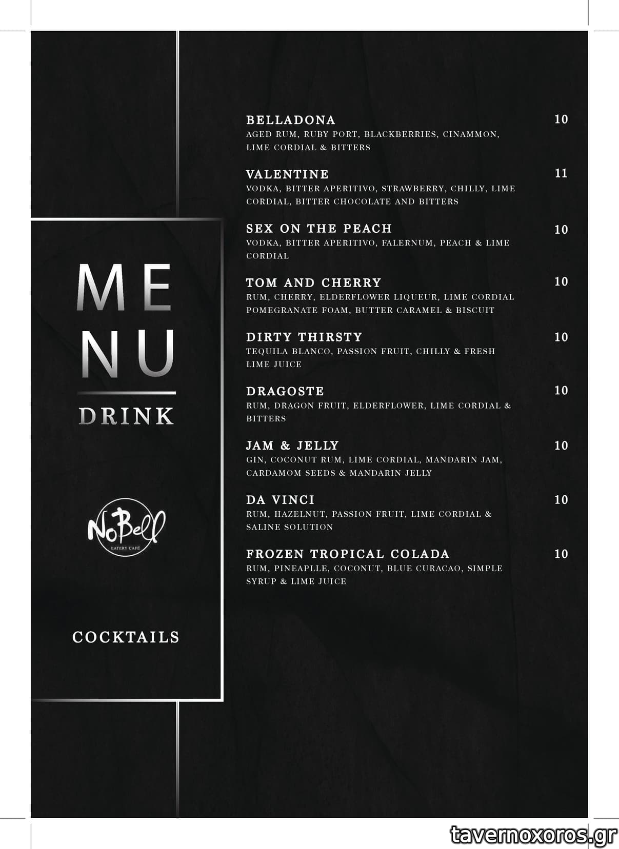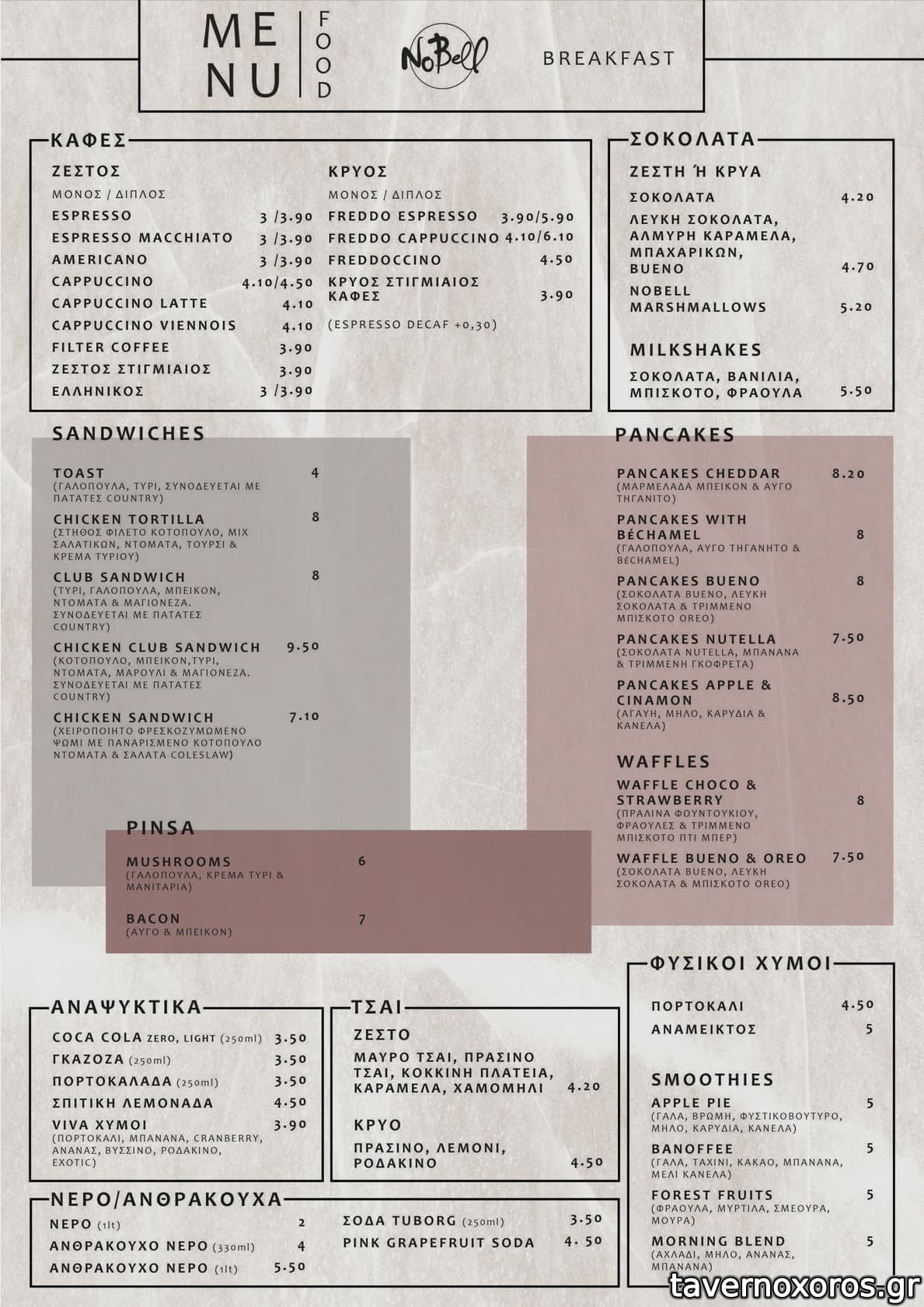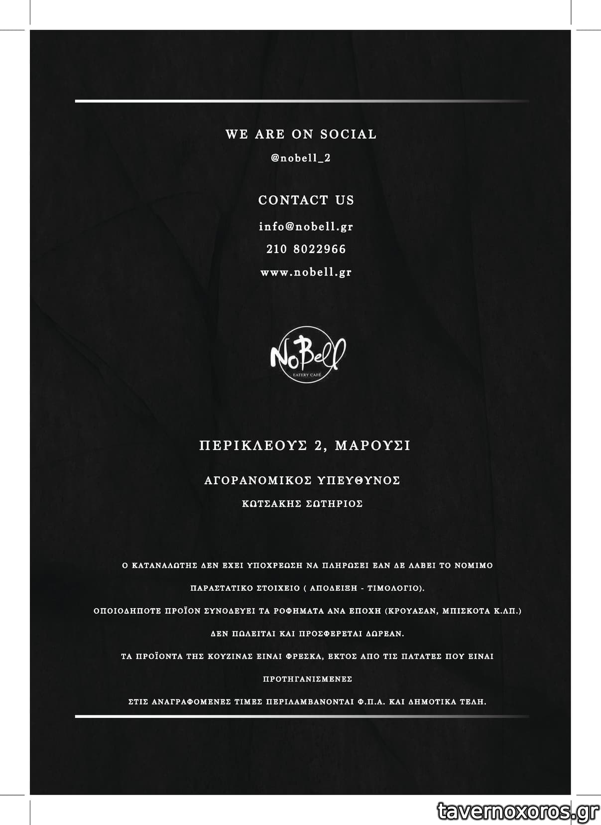 | Λέξεις κλειδιά | Nobel, Νομπελ, #cafe-bar, #πρωινό, #αυγά, #ομελέτα, #σάντουιτς, #τοστ, #club sandwich, #pancakes, #βάφλες, #pinsa, #τσάι, #χυμοί, #ποικιλία τυριών, #ποικιλία αλλαντικών, #quesadillas, #ζυμαρικά, #ραβιόλι, #ριζότο, #μακαρονάδες, #κοτόπουλο, #μπιφτέκι, #χοιρινή, #πίτσα, #γύρος, #burgers, #προφιτερόλ, #μιλφέιγ, #cocktails, #ποτά |