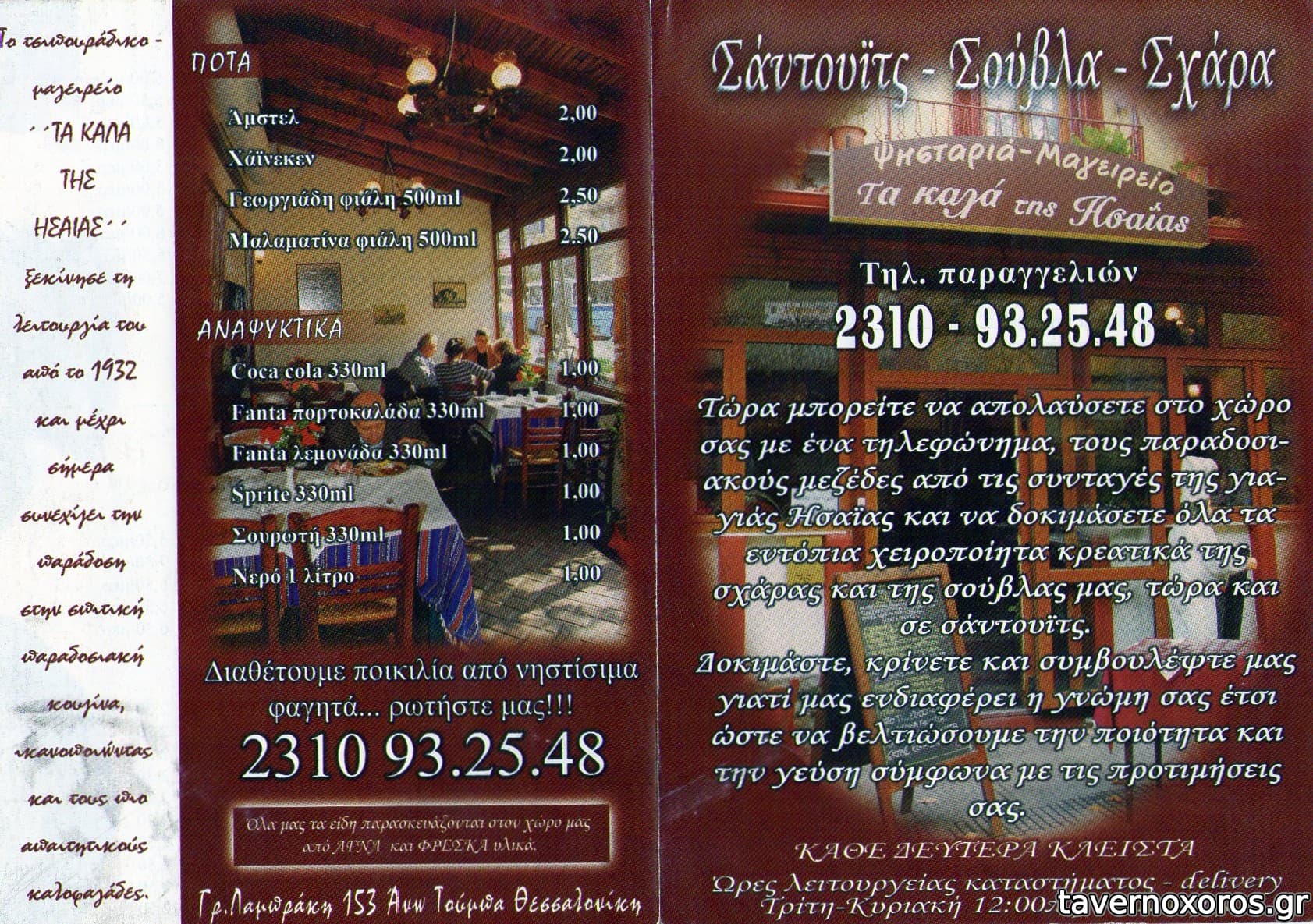 "Το μαγαζί και το οίκημα (μονοκατοικία) χτίστηκε το 1932 από τον παππού μου και λειτούργησε σαν μαγειρείο για πρώτη φορά και αργότερα το 1959 άλλαξε σε καφενείο το οποίο αφού συγχωρέθηκε ο παππούς ανέλαβε ο μπαμπάς με θαμώνες γυρολόγους παλιατζήδες και οικοδόμους. Το ξεροσφύρι κυριαρχούσε εκείνη την εποχή και ο μεζές ερχόταν από το σπίτι του κάθε θαμώνα. Εάν ερχόσουν άγνωστος και καθόσουν και ζητούσες και κανένα μεζέ από τον πατέρα μου αυτός θα γελούσε στην καλύτερη περίπτωση και στην χειρότερη θα σε έστελνε να πας για μεζέ αλλού. Ωραία χρόνια τότε ώσπου το 1997 το μαγαζί άλλαξε σε την σημερινή του μορφή με το όνομα "ΤΑ ΚΑΛΑ ΤΗΣ ΗΣΑΐΑΣ" (το όνομα της γιαγιάς μου, δηλαδή του παππού η γυναίκα) η οποία ονομαζόταν ΗΣΑΐΑ (ΘΕΟΣ ΣΥΓΧΩΡΕΣΤΗΝ) και αυτή. Ήταν ότι πιο τιμητικό για αυτήν ενώ ήταν ακόμη τότε στην ζωή."