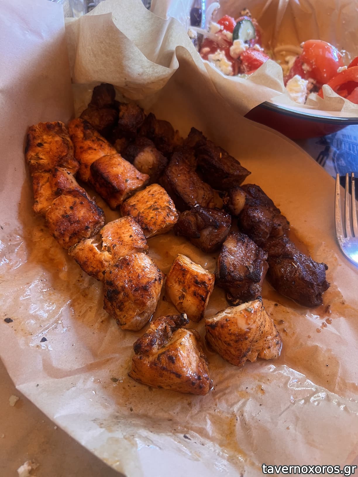 Από κρέατα είναι όλα μέτριες σε ποσότητα μερίδες στην λαδόκολα, δοκιμάστηκαν χοιρινό και κοτόπουλο κοντοσούβλι, και τα δύο μέτρια (ουσιαστικά είναι τα ίδια κρέατα με όλα τα γύρω μαγαζιά απλά τα δικά τους έχουν πολλά κιλά μαρινάδα παραπάνω). Αν τους ζητήσεις σαλάτα, σου φέρνουν ντομάτα σκέτη στην λαδόκολλα και αλοιφές (που αναγκαστικά θα πάρεις γιατί από την στιγμή που δεν έχει πατάτες θες κάτι συνοδευτικό στην κρεατίλα) είναι σε διάφανα πλαστικά μπολάκια.