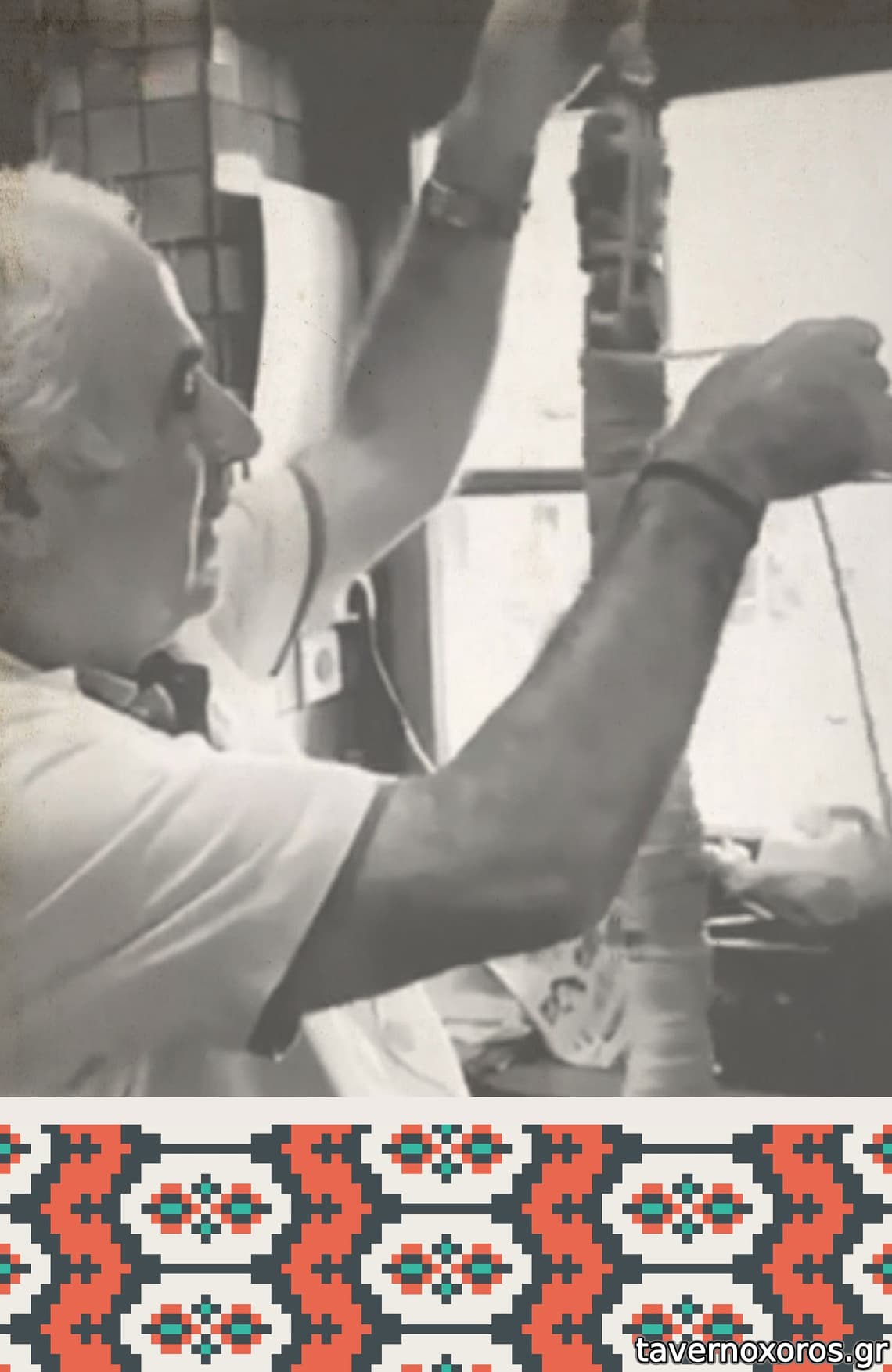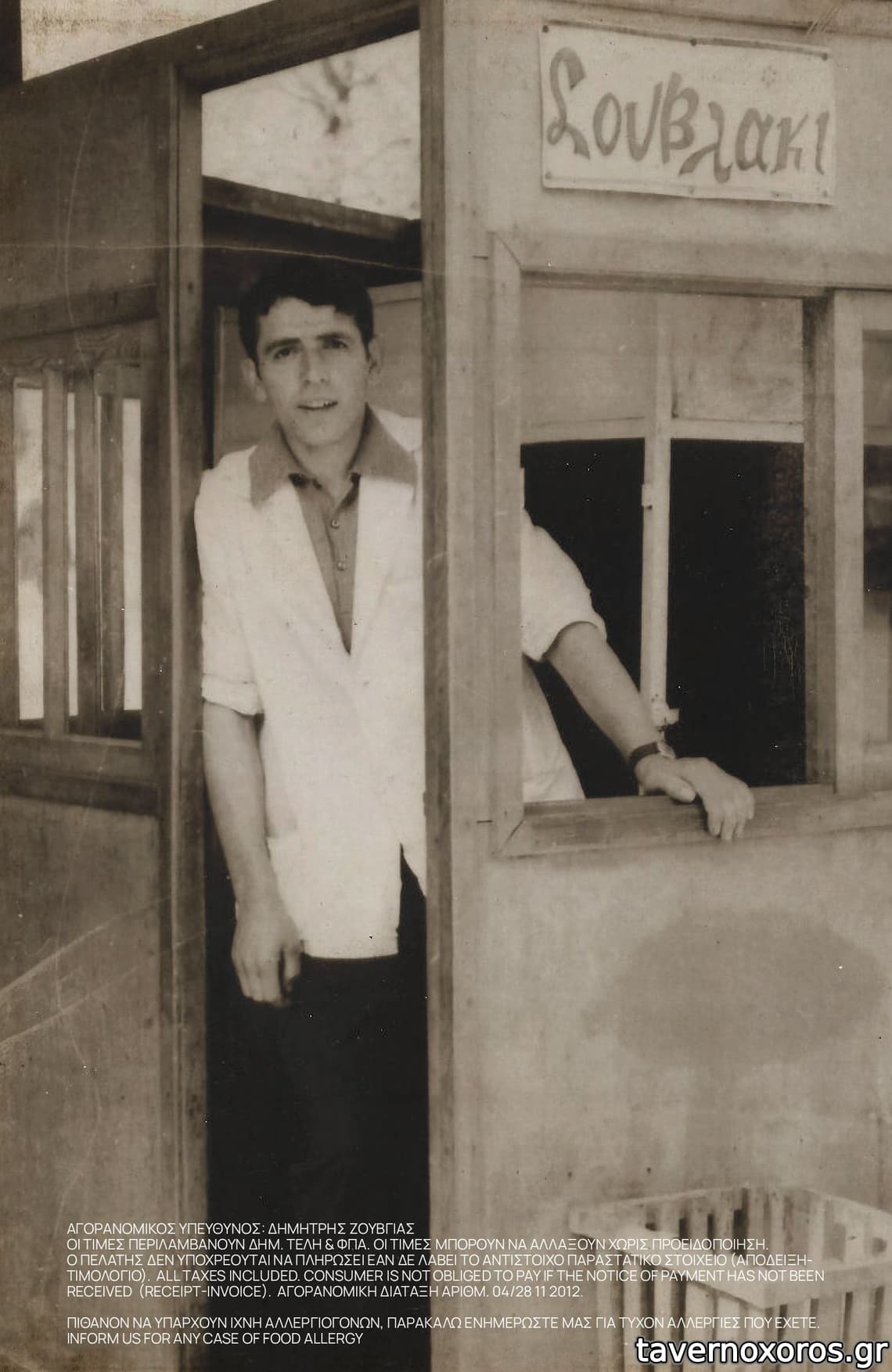 Απρίλιος 1991. Επιγραφή με το όνομα του ιδρυτή (ζούσε τότε ο μπαρμπα-Τάκης). Κοντοσούβλι 500 δρχ., κοκορέτσι 350 δρχ., σουβλάκι 79 δρχ.