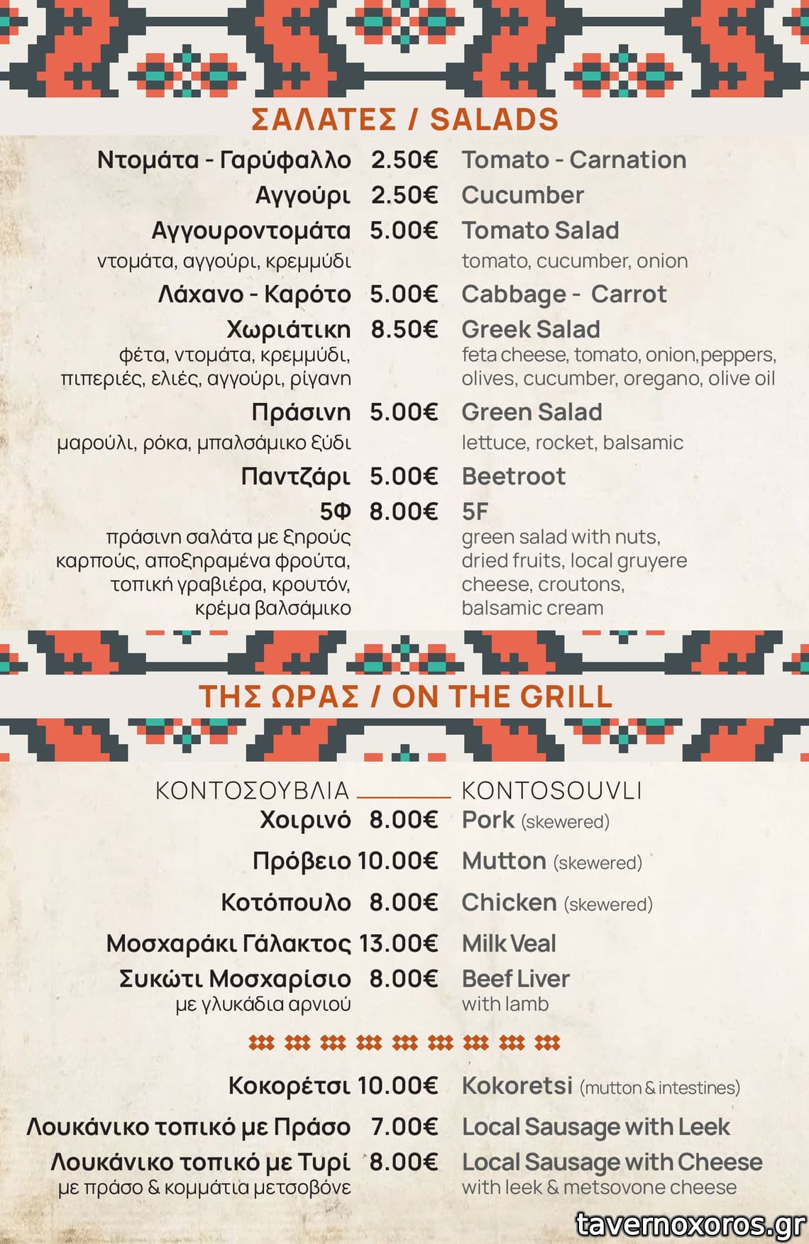 Εκτός από κοντοσούβλι (6€) που το καλοκαίρι έχει και πρόβειο (αλλά σκληρό), και το κοκορέτσι (6€), έχει και λουκάνικο (4€) εργοστασίου Metsovita, όπως και τυράκι ντόπιο, ίσως και καμιά ντομάτα γαρύφαλο και ψωμί.