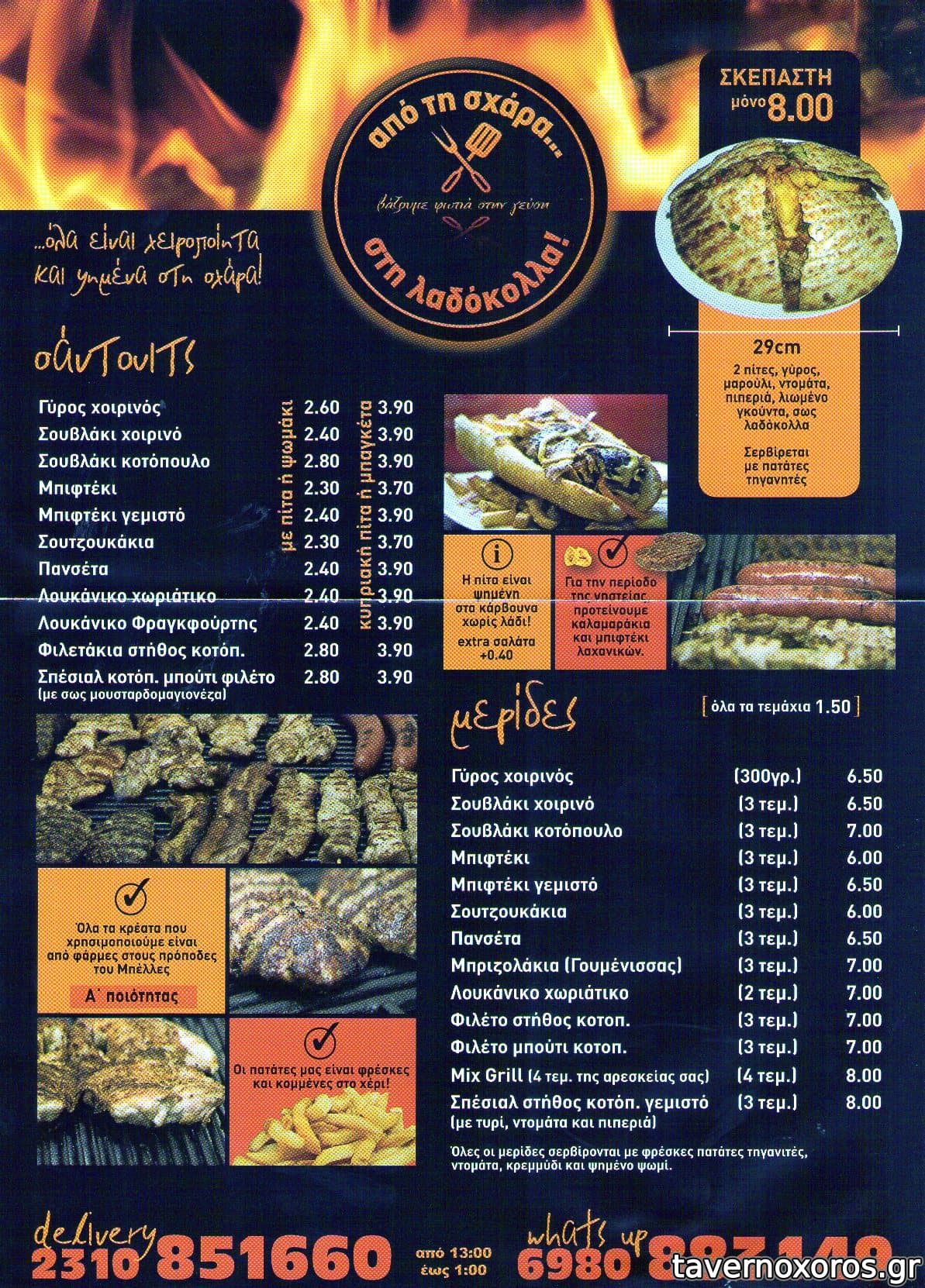 Φαγητό: Από ποιότητα και ποσότητα είμαι υπερευχαριστημένος. Έχω πάρει φιλέτο κοτόπουλο και χοιρινό σουβλάκι, και ήταν καλοψημένα και νόστιμα. Οι πατάτες επίσης μετράνε τρελά, και το ψωμί που βάζουν από κάτω στις μερίδες τα σπάει.