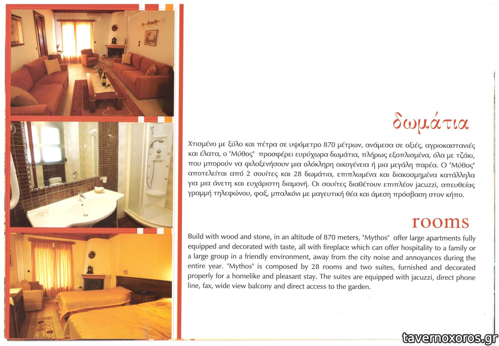 | Λέξεις κλειδιά | #ξενοδοχείο, #πισίνα, #γρασίδι, #παιδική χαρά, #τζάκι, #πρωινό, #σούβλες, #κεμπάπ, #αρνάκι, #κατσικάκι, #κοκορέτσι, #αγριογούρουνο, #ζαρκάδι, #κότσι, #μπιφτέκι, #σνίτσελ, #χοιρινή, #λουκάνικο, #τηγανιά, #κοτόπουλο, #πανσέτα, #ψαρονέφρι, #παϊδάκια, #λαχανοντολμάδες, #μανιτάρια, #ροκφόρ, #χαλούμι, #ξινοτύρι, #πίτες, #γλυκά του κουταλιού, #λικέρ |