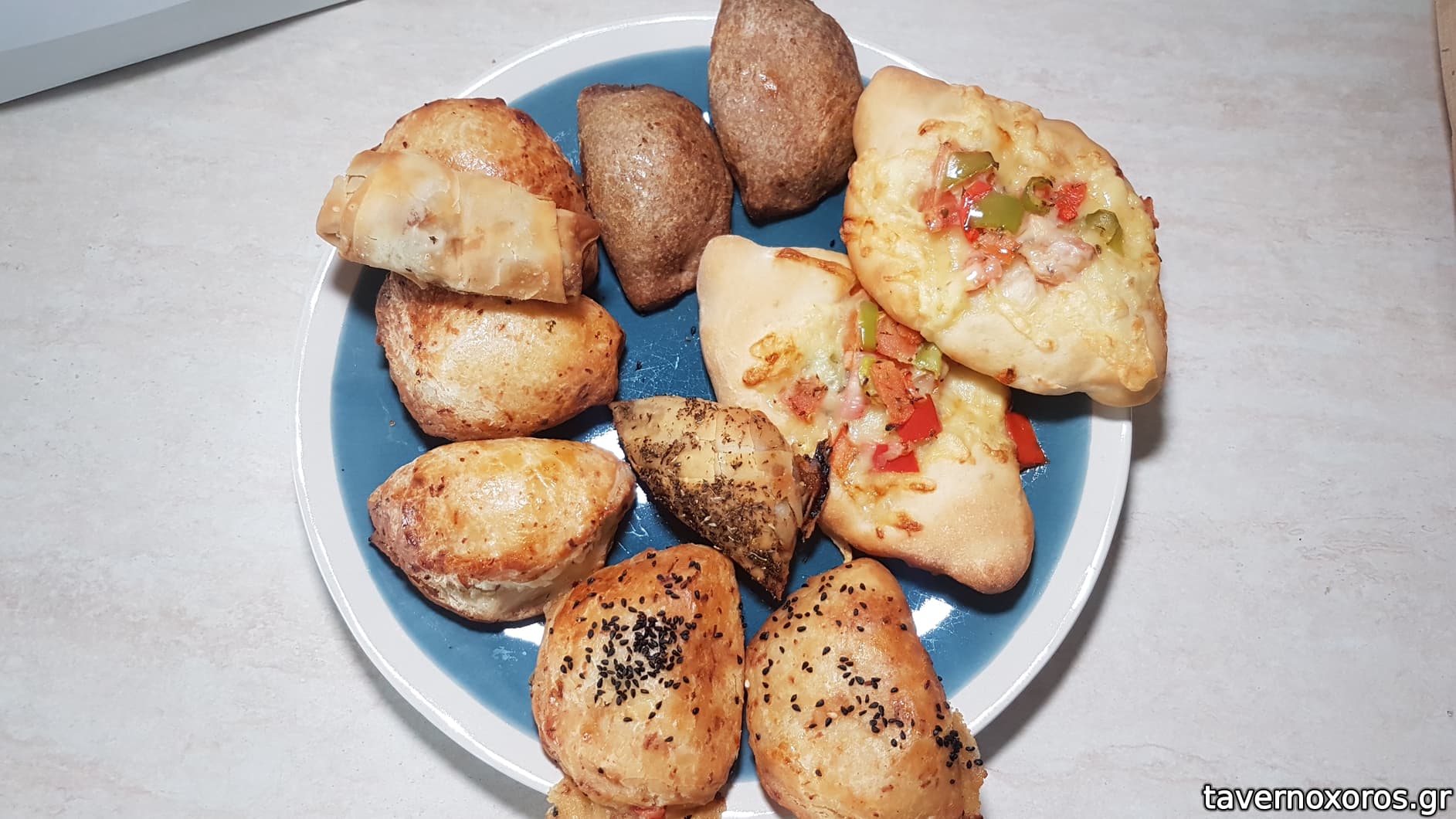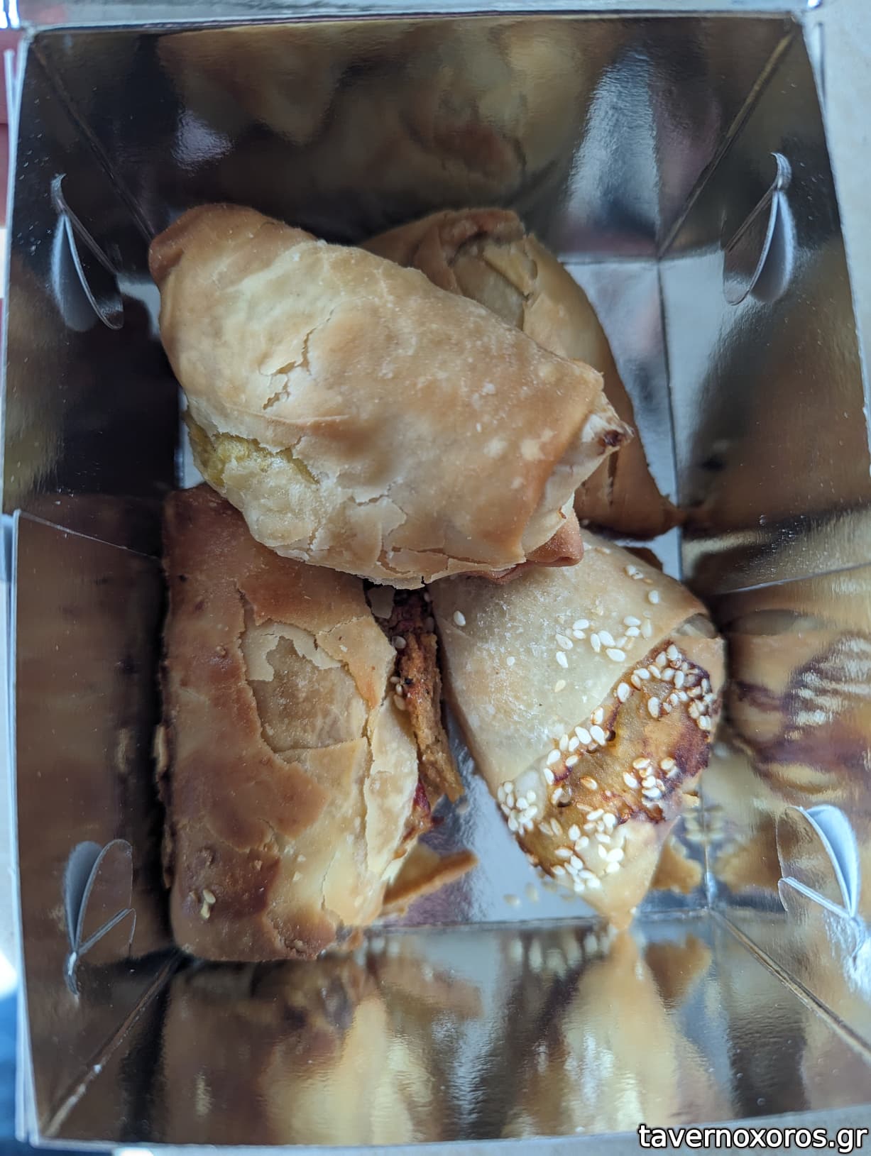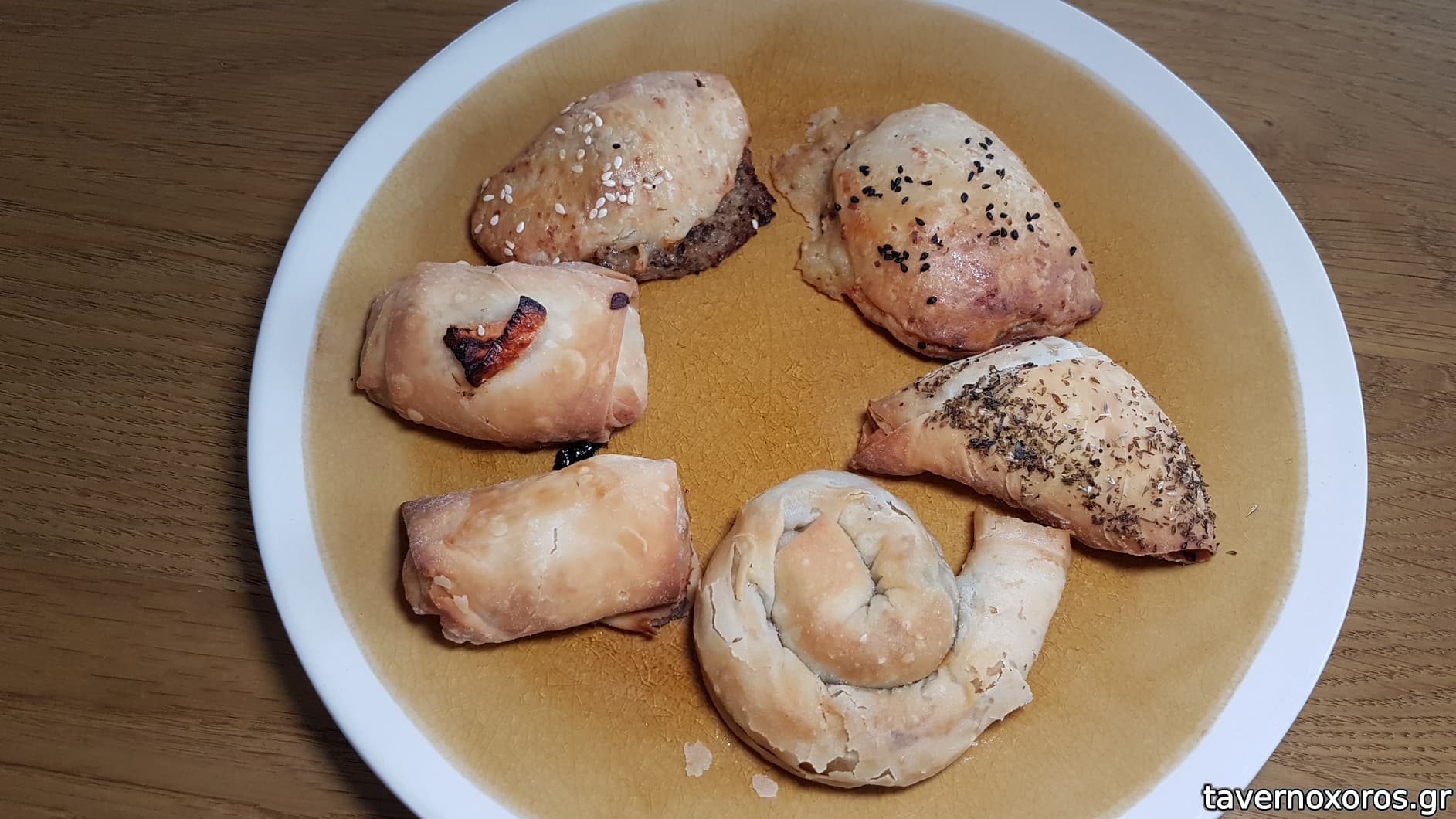 Με φορά ρολογιού: πιτάκι με κιμά (οκ) & πιτάκι με κοτόπουλο (πολύ καλό) & πιτάκι με μελιτζάνα (πολύ καλό) & στριφτή με πράσο (οκ) & πιτάκι με ντομάτα (οκ)