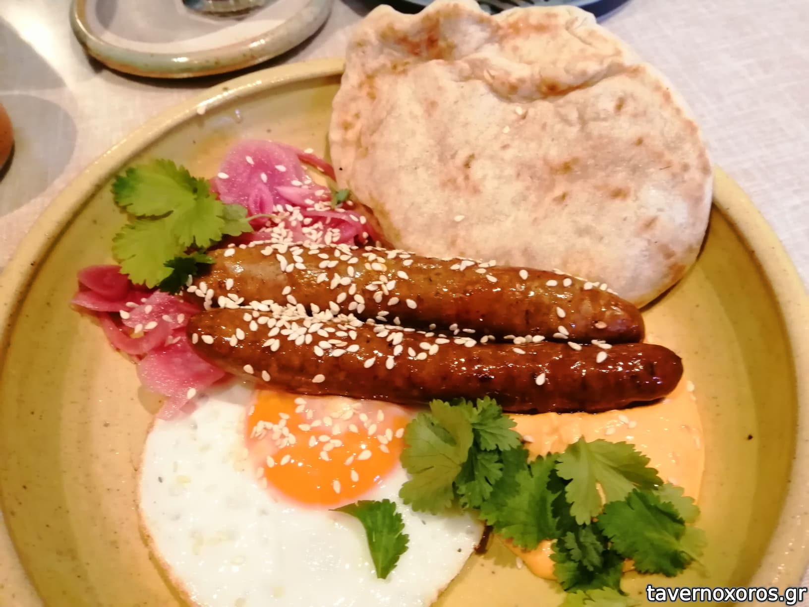 Merguez sausages with harissa cream cheese, pickled red onion, toasted sesame seeds & a fried egg on flatbread