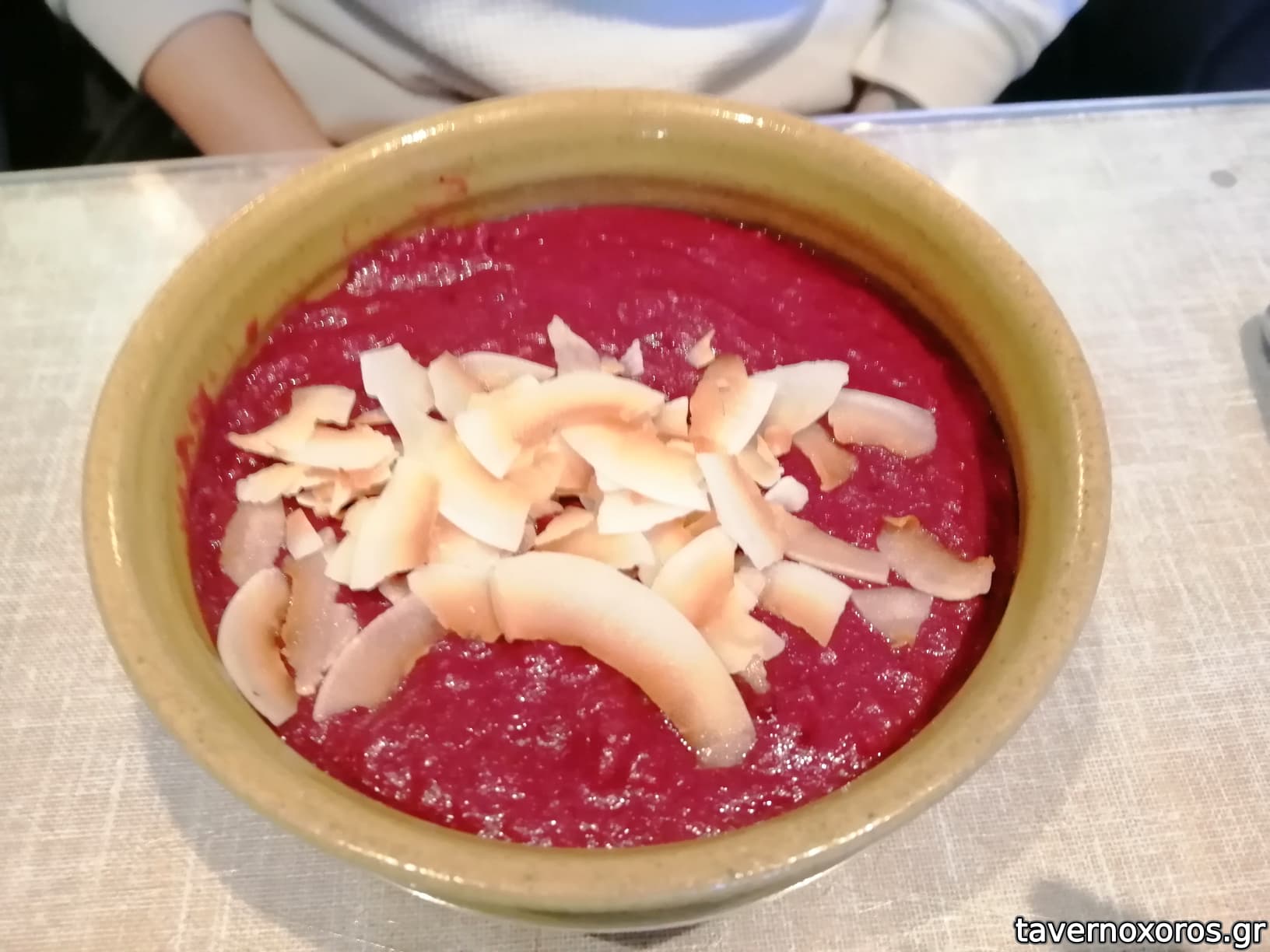 Oats, hibiscus coconut milk, beetroot & apple topped with maple syrup, pumpkin seeds & toasted coconut