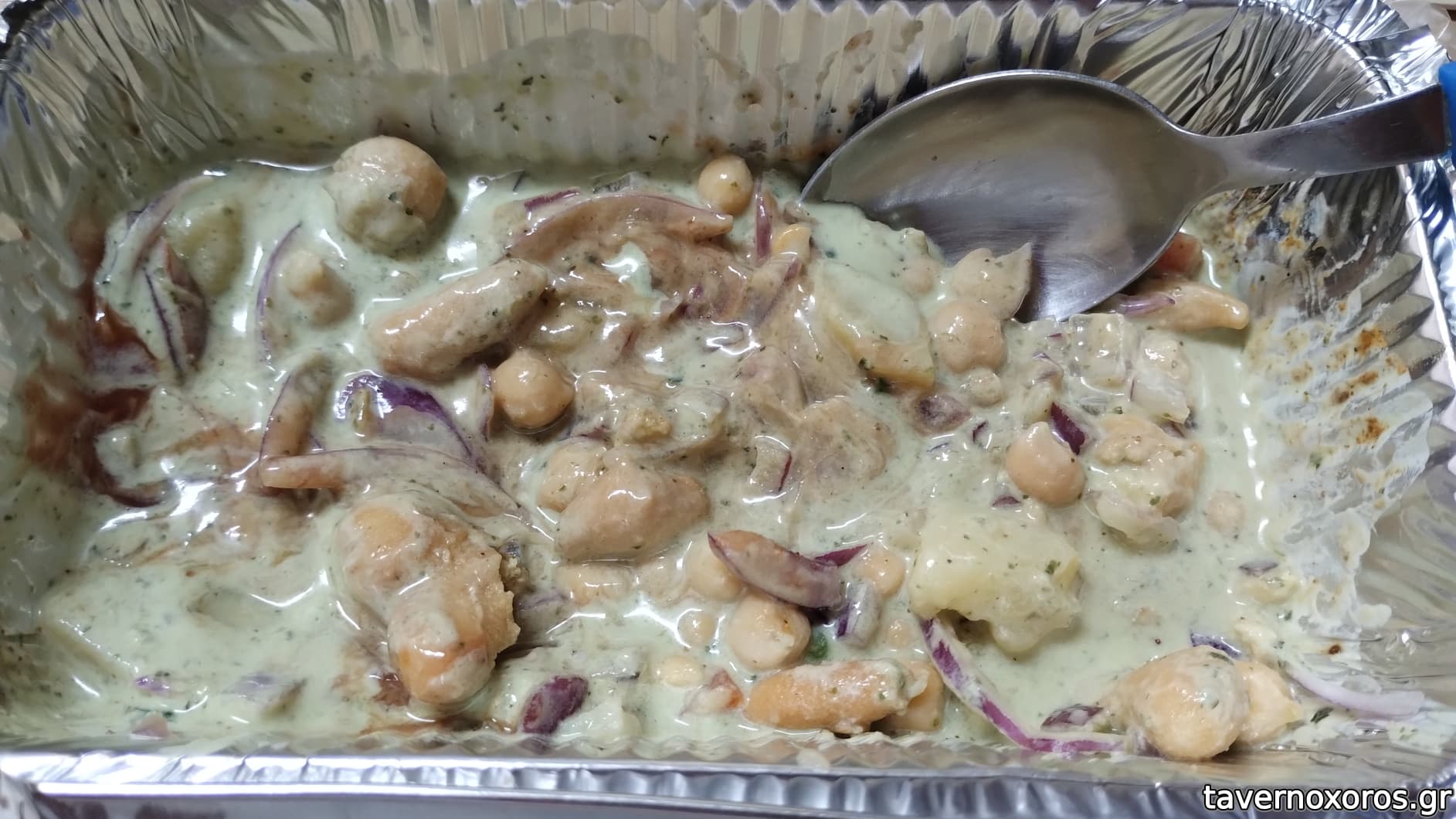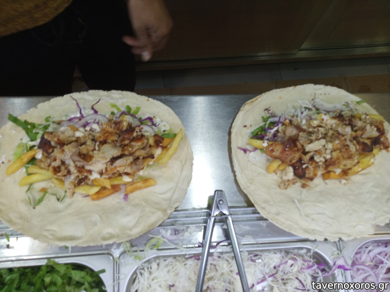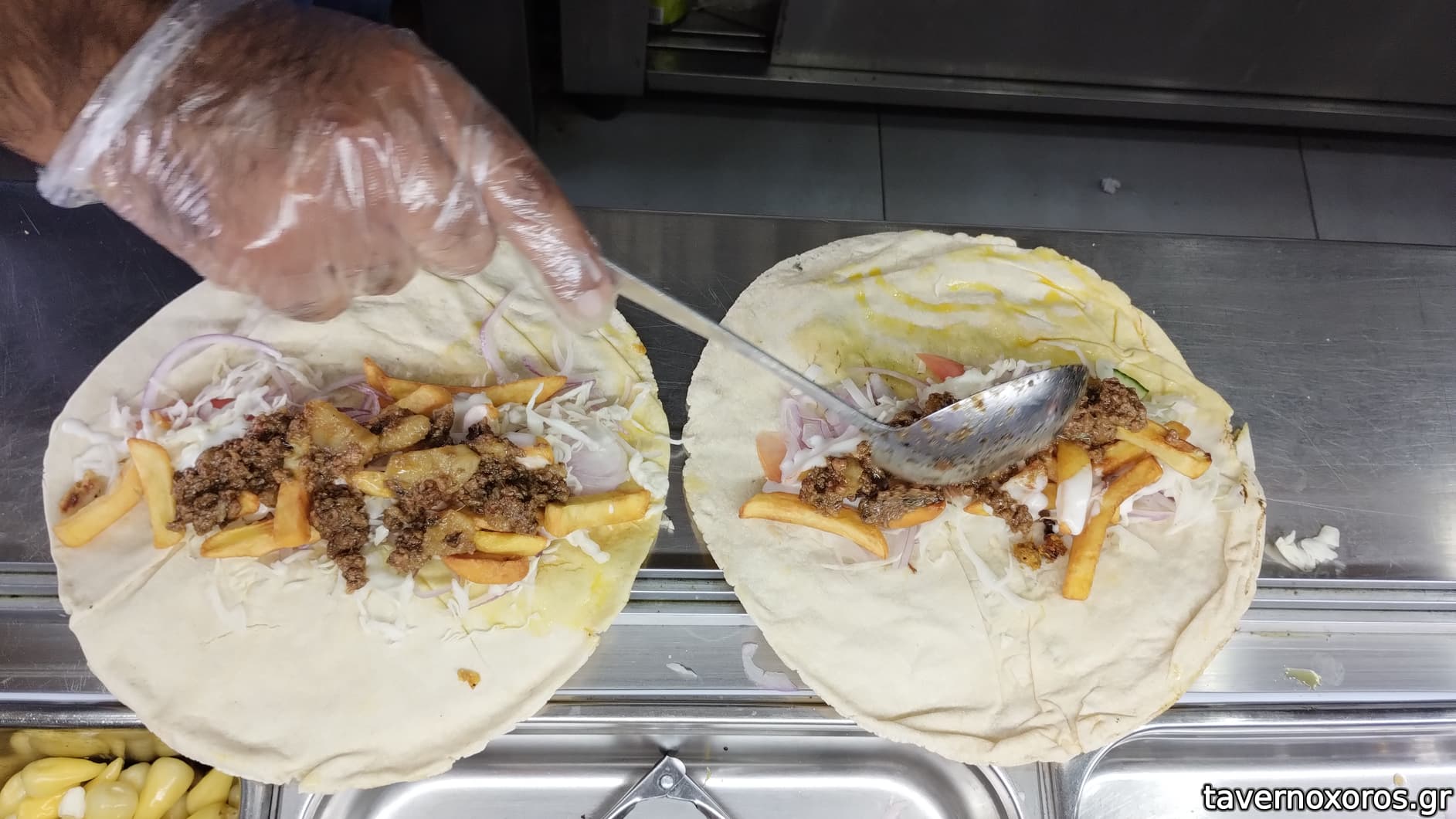 Ετοιμασία: αριστερά το κιμάς-μπιζέλι, δεξιά ο γύρος κοτόπουλο