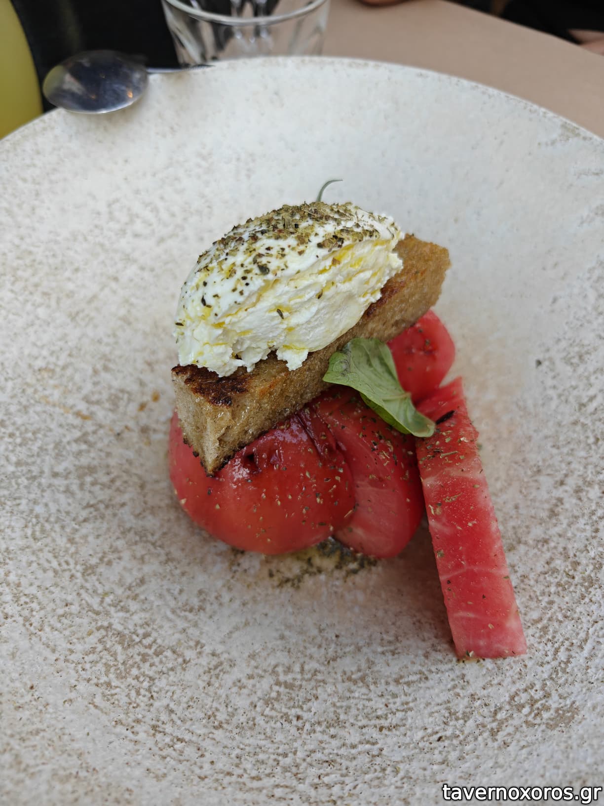 Ντομάτα με καρπούζι συνοδεία από ξινομυζήθρα και ψημένο ψωμί (φοβερά ταιριαστός ο συνδυασμός γεύσεων)