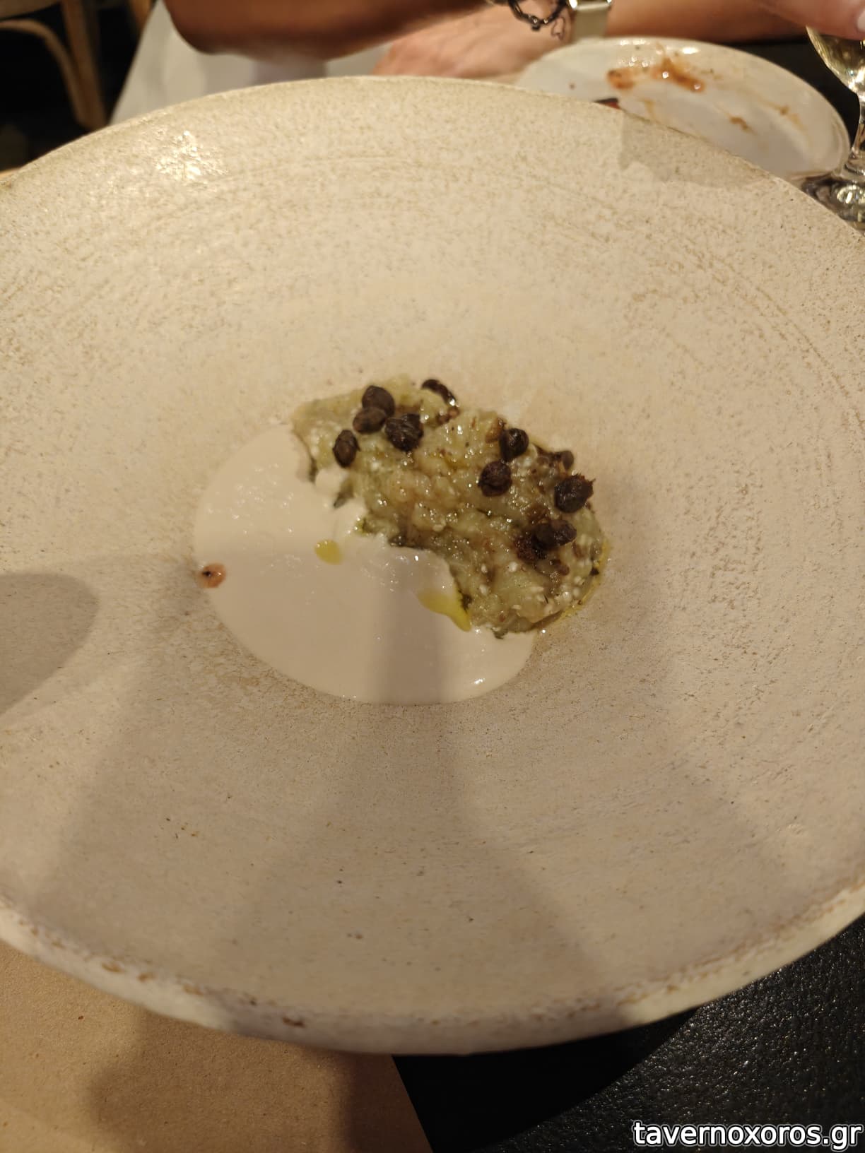 Μελιτζάνα ψητή, κρέμα αμυγδάλου, κάπαρη τηγανητή (πολύ καλή και έντονα καπνιστή η μελιτζάνα)