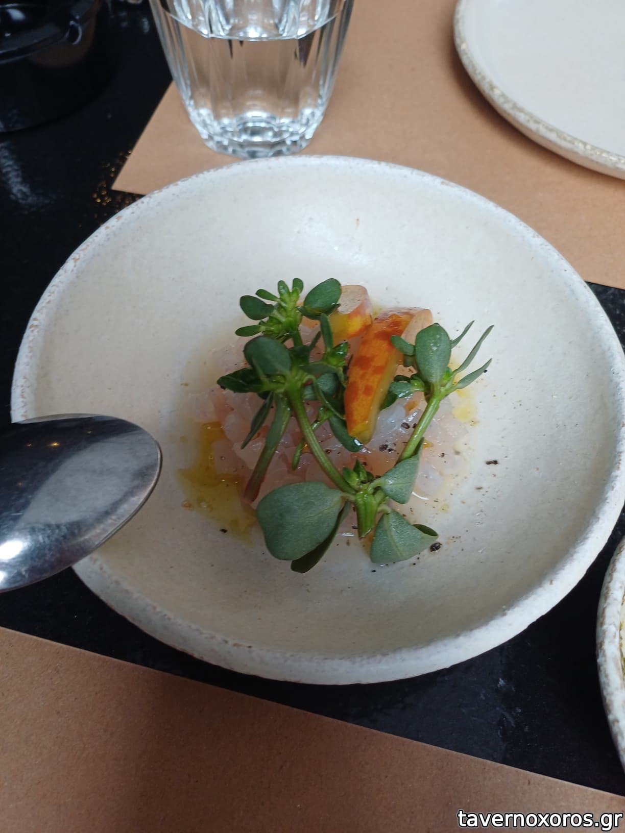 Ταρτάρ κατσικάκι, μια χαρά αν και ήθελε λίγο αλατάκι, αλλά κυριολεκτικά μια κουταλιά φαγητού μέσα σε ένα γιγάντιο πιάτο (γενικά, όπως και στη Μούργα, έπαιζαν γιγάντια πιάτα χωρίς λόγο).