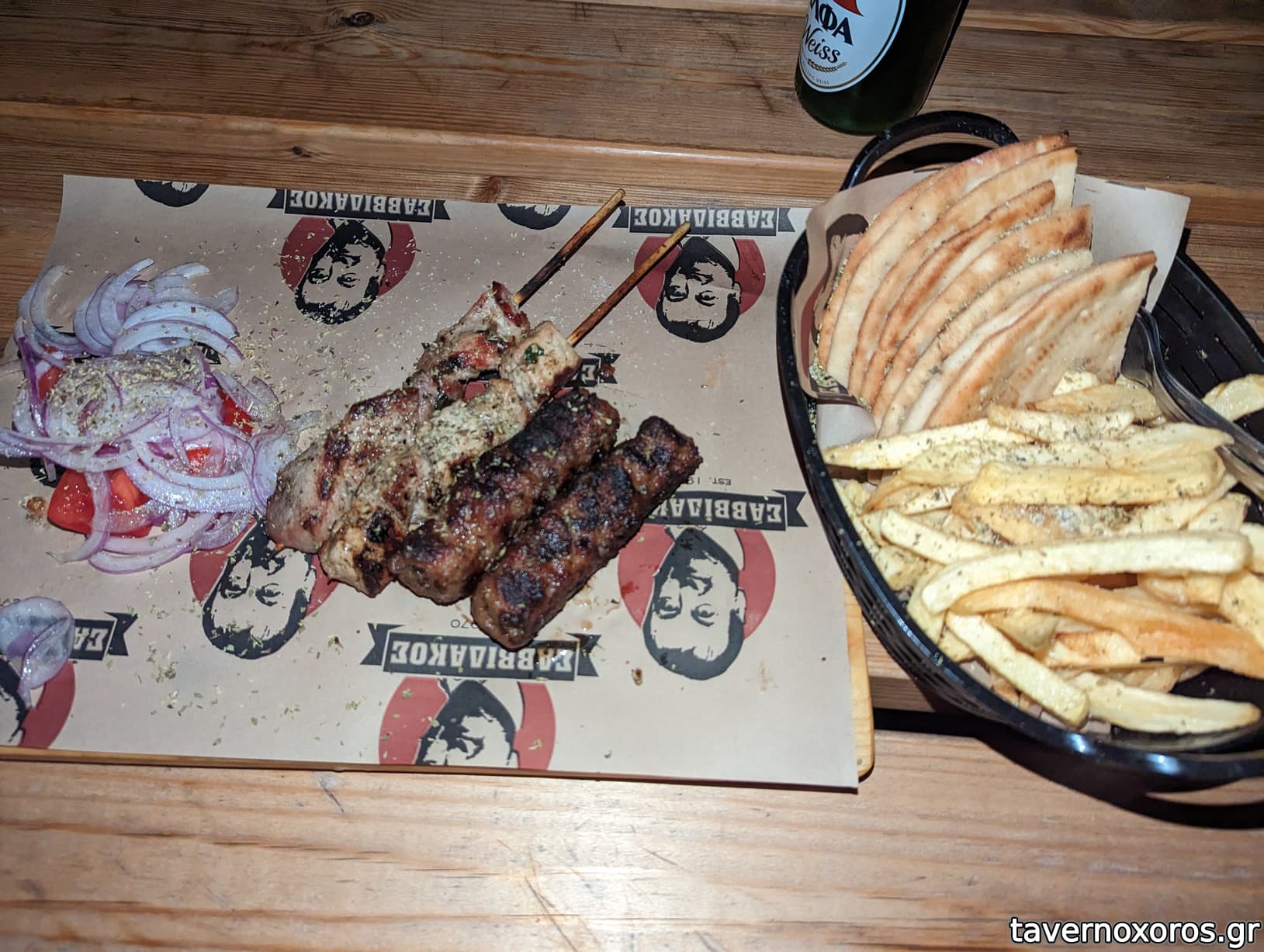 Όσον αφορά στα τεμάχια, σουτζουκάκι (με κύμινο) πολύ δυνατό, σουβλάκι χοιρινό καλό. Αγγουροντομάτα έτσι κι έτσι. Προτείνεται ασυζητητί.