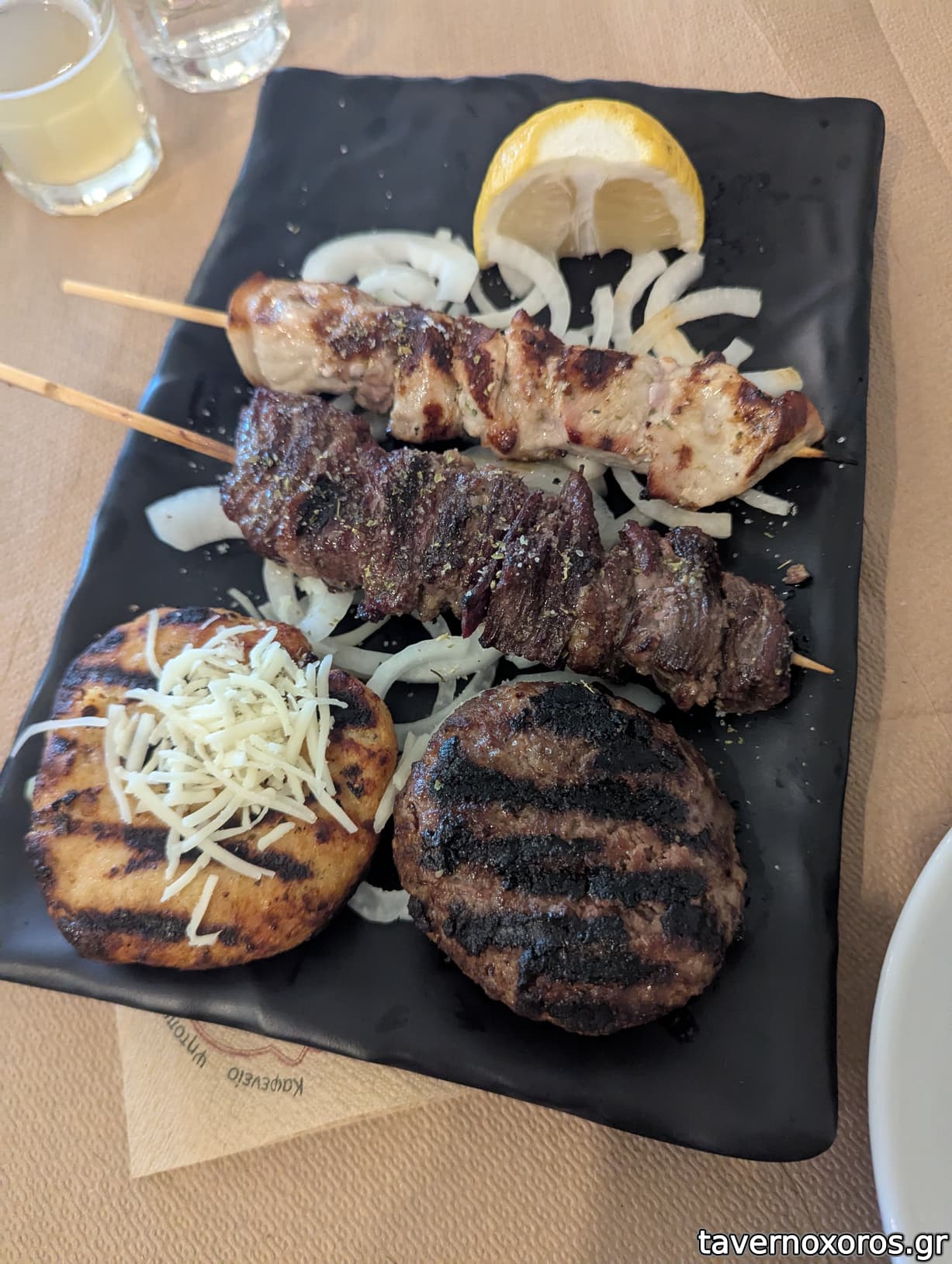 Σουβλάκι χοιρινό (στεγνό), σουβλάκι μοσχαρίσιο (πολύ καλό!), κοτοκεφτές (not my style), σουτζουκάκι μπιφτέκι (καλό μείγμα κιμά, ένα κλικ πιο ψημένο)