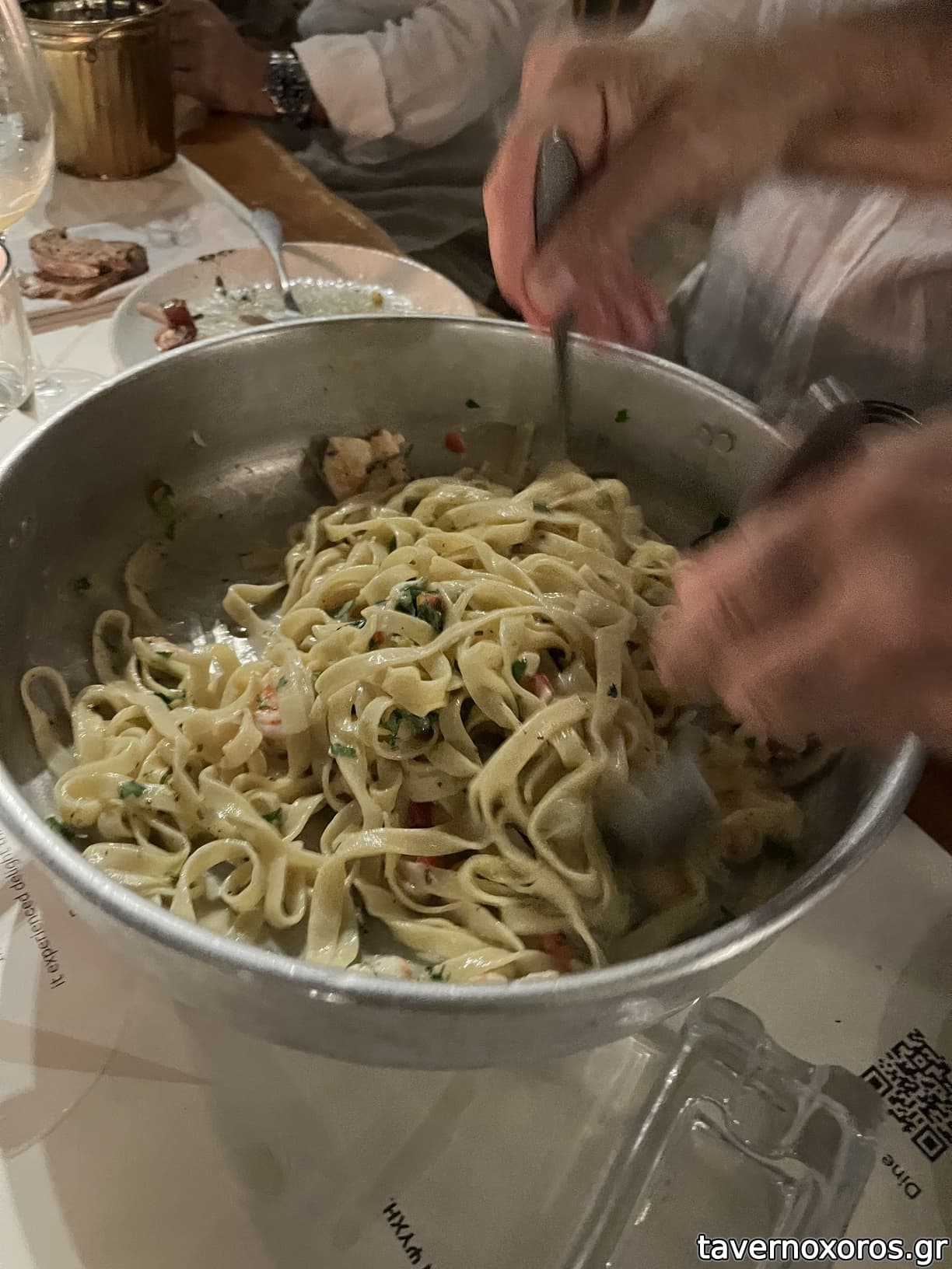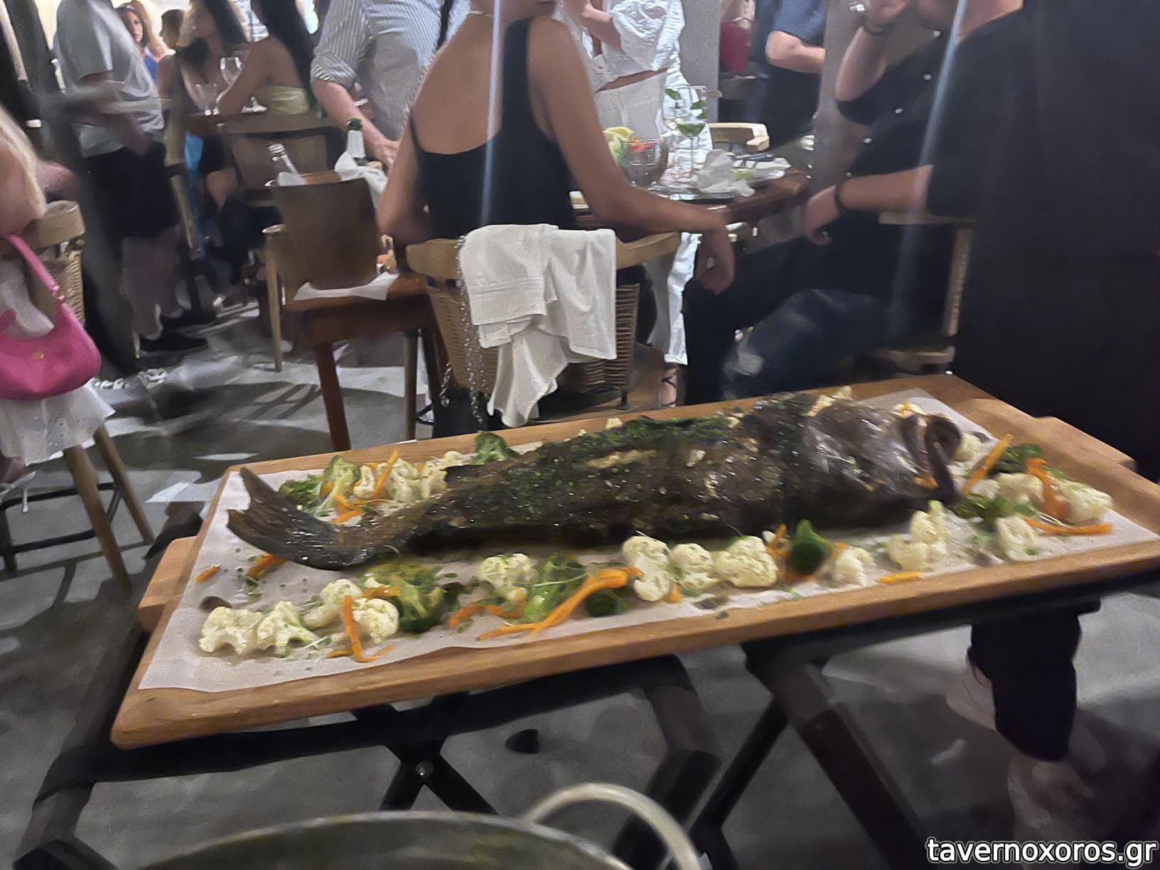 Δυσκολεύομαι να σκεφτώ τι να γράψω. Αν πρέπει να το κρίνω ως φαγητό, ήταν αρκετά καλύτερο από ο,τι περίμενα. Η μακαρονάδα με μακαρόνια με μελάνι και θαλασσινά ήταν από τις καλύτερες που έχω φάει, πραγματικά φοβερή. Μυλοκόπι φέτα πολύ καλά ψημένο και με ενδιαφέρον κους κους ως συνοδευτικό. Σαλάτα καρπούζι, οκ....Άρεσε, σε εμένα όχι τόσο, ίσως για την περίμενα αλλιώς, δεν περίμενα τόσο πρωταγωνιστή το καρπούζι. Χέλι με καρπάτσιο παντζαριου καλό και κάτι κεφτεδάκια για τον μικρό απλά οκ. Στο μενού θα προτιμούσα περισσότερες βέβαια επιλογές στα κυρίως. Είχαμε γαριδομακαρονάδα, μακαρονάδα με το μελάνι που πήραμε, αστακομακαρονάδα, αστακό γιουβέτσι. Υπήρχε υπερβολικά πολύ ζυμαρικό και απλά ψάρι ψητό. Δεν είχαμε δηλαδή κάποιο ιδιαίτερο τρόπο μαγειρέματος στα κυρίως. Τιμές υψηλές (αστακομακαρονάδα 150/κιλό πχ). Και σε αυτά που λίγο μου την δίνουν εμένα, κόσμος που δεν μου ταιριάζει, οι γυναίκες ειδικά ήταν σαν να πήγαιναν σε γάμο και γενικά λίγο το στιλ....νομίζω καταλαβαίνετε. Τι πήγες θα μου πεις....