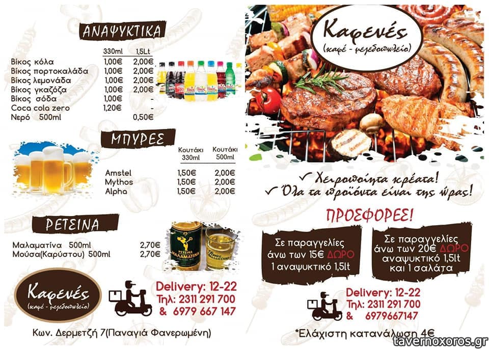 | Λέξεις κλειδιά | Γιατί το καφενείο είναι σχολείο, #burgers, #μεζέδες, #σάντουιτς, #tv, #μπιφτέκι, #πανσέτα, #λουκάνικο, #μπιφτέκι γεμιστό, #κοντοσούβλι, #σουβλάκια, #σουτζουκάκια, #τηγανιά, #χοιρινή, #πανσετομπριζόλα, #ribs, #θράψαλα, #μύδια, #μπακαλιάρος, #μανιτάρια, #πάπρικα, #churros |