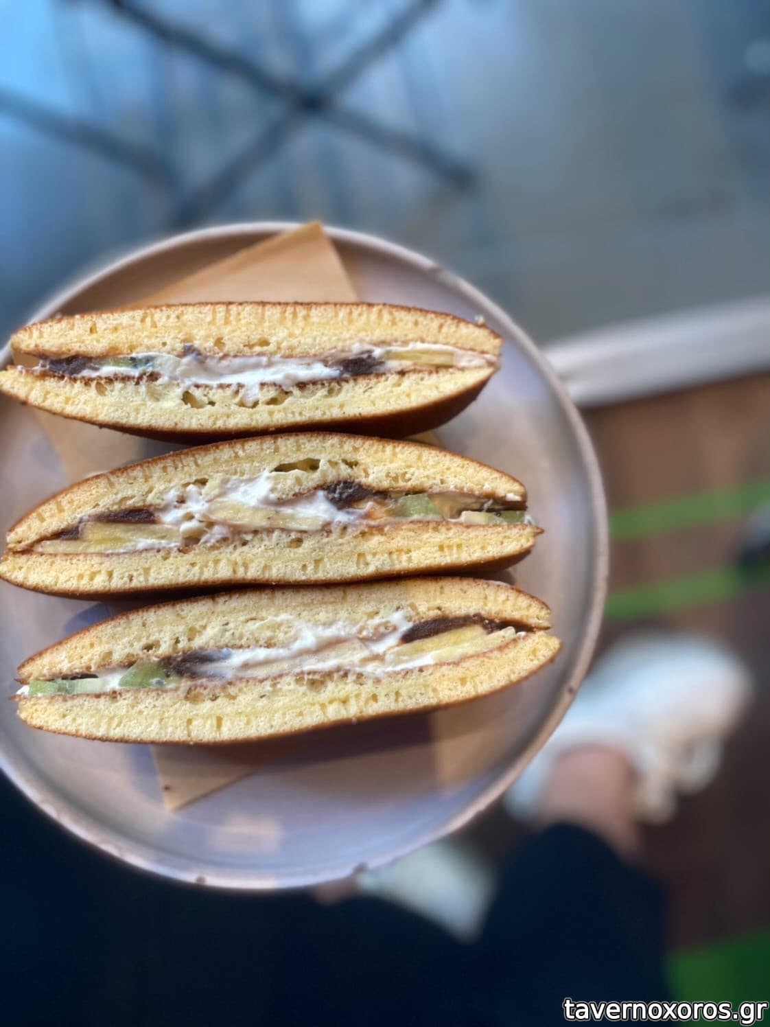 Dorayaki pancakes με κρέμα από τσάι και φρούτα (ήταν φτιαγμένοι νωρίτερα όποτε δεν έβγαζαν φρεσκάδα)