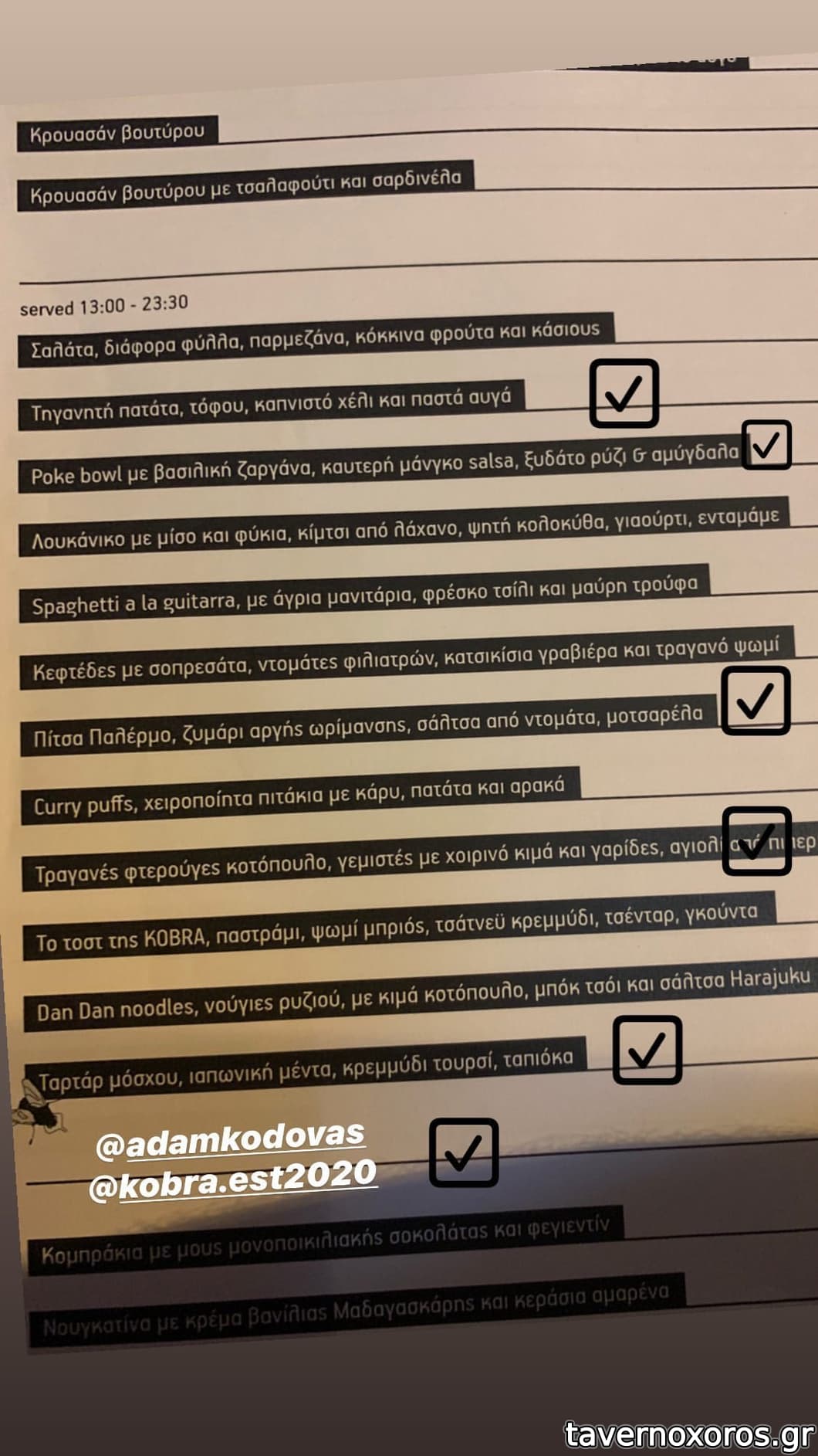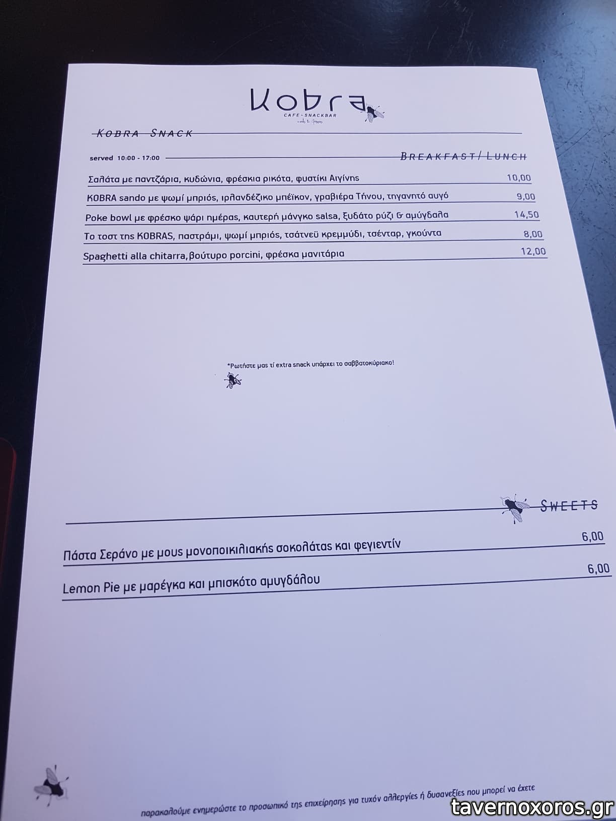 "KOBRA sando με ψωμί μπριός, ιρλανδέζικο μπέικον, γραβιέρα Τήνου, τηγανητό αυγό" (μια χαρά νόστιμο, τα 9€ όμως είναι πολλά)
