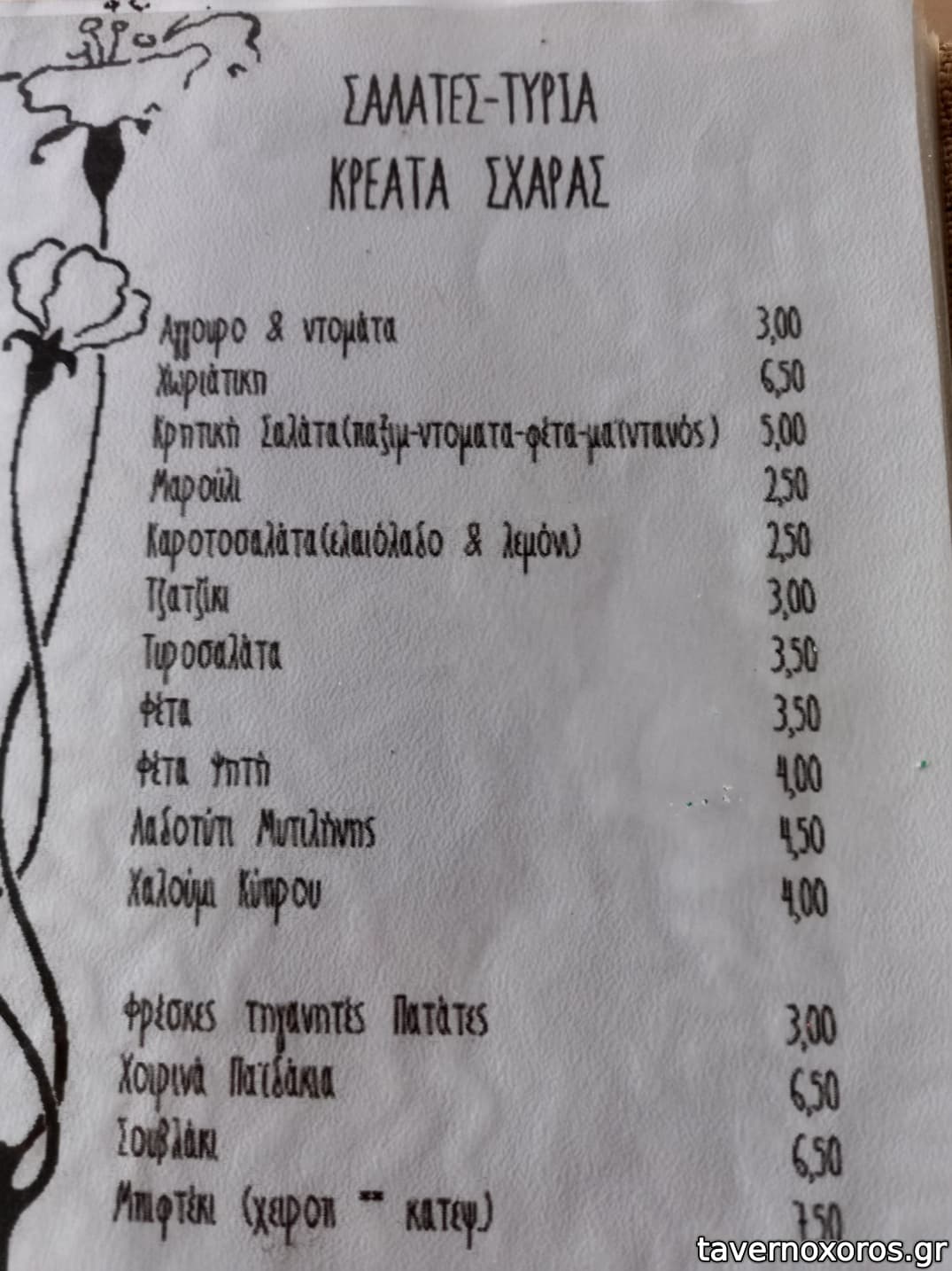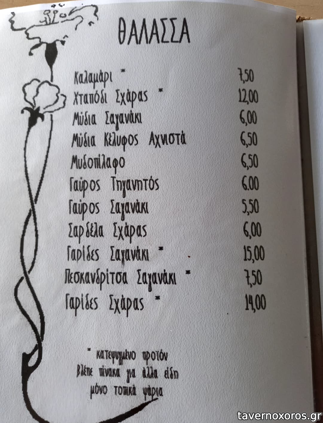 Δοκιμάστηκαν πατάτες τηγανιτές (πολύ καλές), κολοκυθάκια τηγανητά (πολύ νόστιμα), τυροσαλάτα (νόστιμη), κρητική σαλάτα (καλή), σκουμπρί καπνιστό (καλό), σαρδέλα ψητή (πολύ καλή), γαύρος (καλός), θράψαλο τηγανητό (κακό). Το χύμα τσίπουρο τους χωρίς γλυκάνισο μπόμπα, το λευκό κρασί καλό.