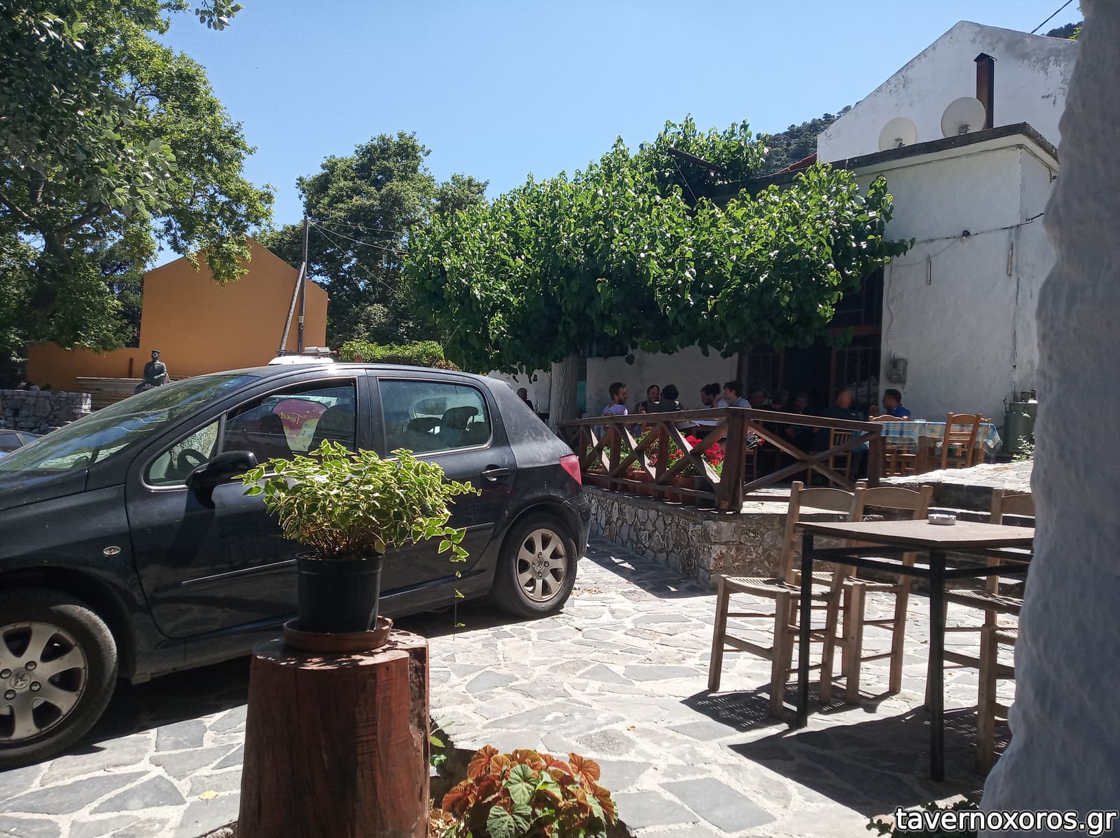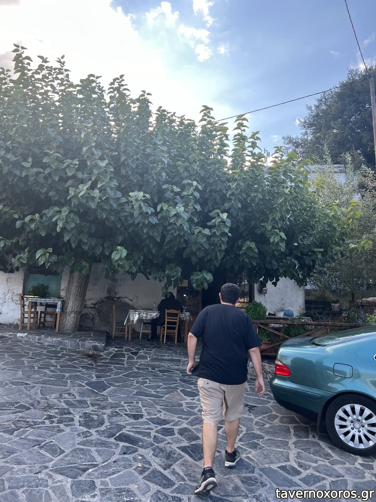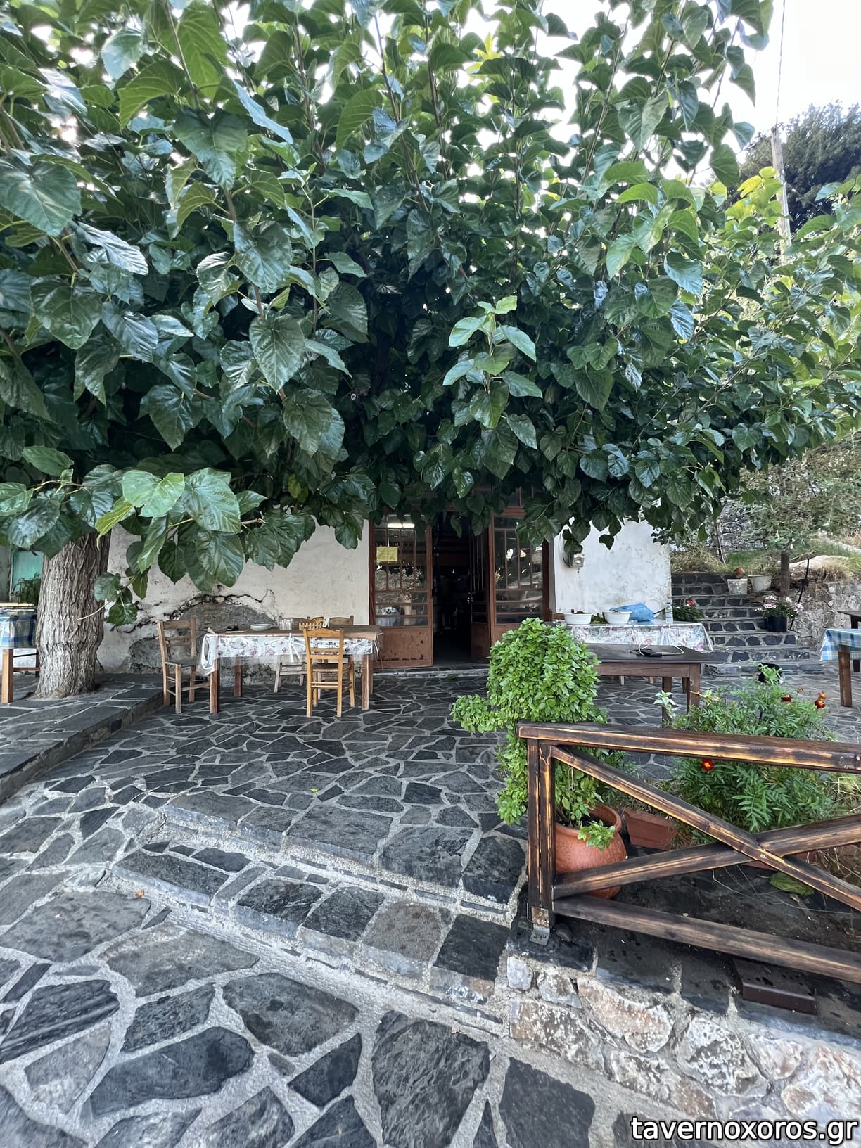 3 εξωτερικά τραπέζια στο σύνολο, κάτσαμε κάτω απ' τη μουριά ενώ παραδίπλα ήταν δυο ακόμα παρέες. ήσυχη μέρα με αεράκι, στο βάθος το οροπέδιο του Ασκύφου.