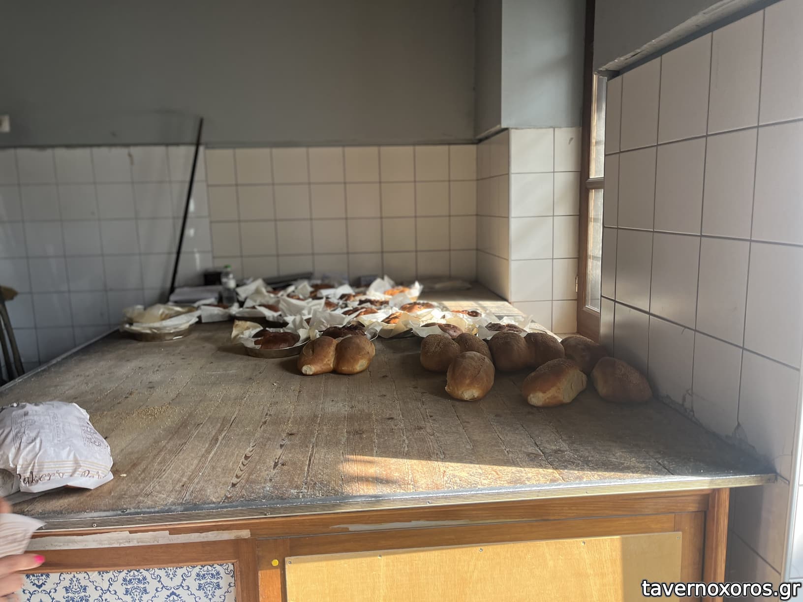 δουλέυει με προζύμι, ξεφουρνίζει φραντζόλα άσπρη και καρβελάκι κίτρινο Λημνιό, με ψίχα σφιχτή και χοντρή κόρα. το μαύρο με μίξη άλευρων και σπόρων, βγαίνει αφράτο και μυρωδάτο.