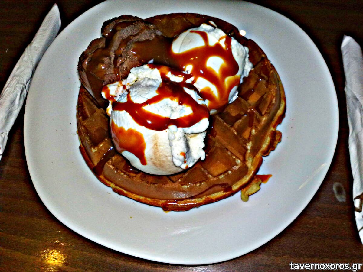 1 βαφλα με 3 μπαλες παγωτο, σοκολατα, μπανανα, κρεμα, και σως καραμελ τοφι απο πανω.