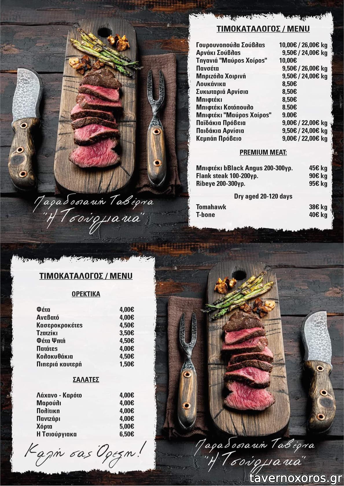 Παραγγείλαμε μπιφτέκι (πολύ καλό), αγριογούρουνο τηγανιά (εξαιρετικό), λουκάνικο (ωραίο), χοιρινή μπριζόλα (3 τεμάχια με κόκαλο από μικρό ζώο λίγο σκληρό). Το κρέας είχε ιδιαίτερη νοστιμιά χωρίς σάλτσες και μπαχαρικά. Ο ίδιος (Γιώργος) μένει όλο το χρόνο εκεί και εκτρέφει δικά του ζώα