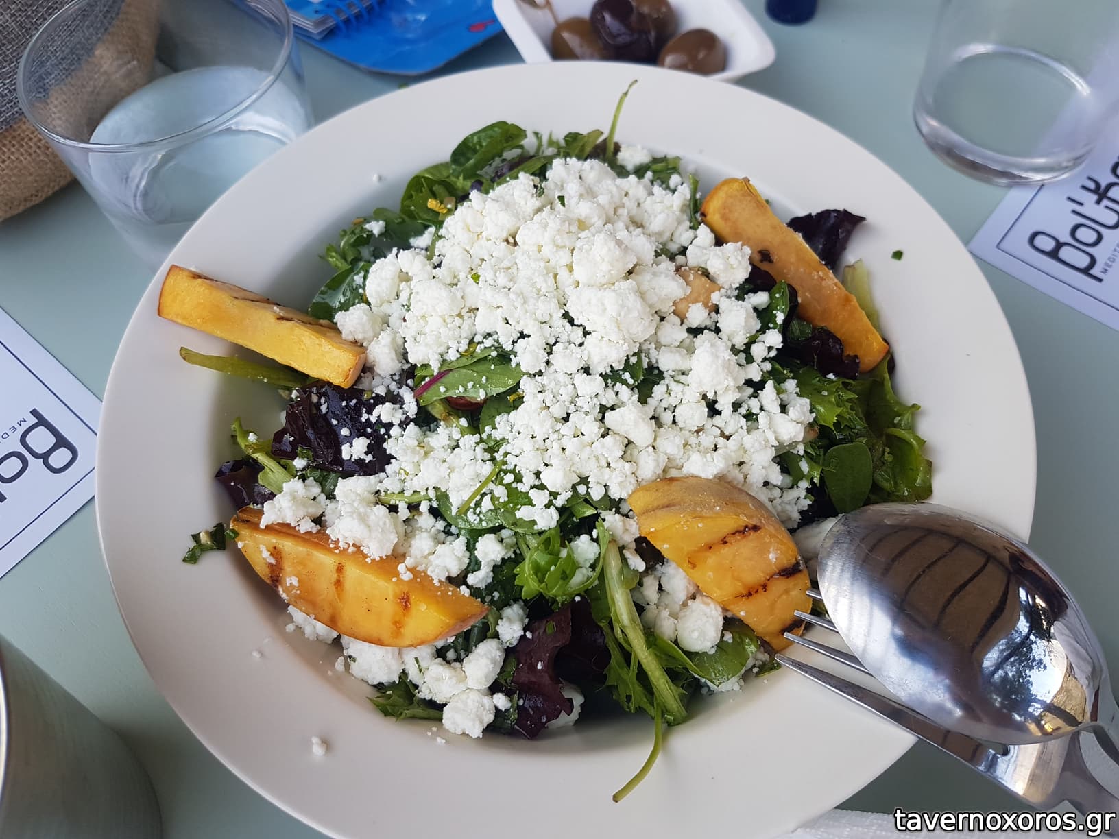 "Πράσινη: ψητό ροδάκινο, καβουρδισμένο φουντούκι, vinaigrette από παλαιωμένο τσίπουρο, κατσικίσιο τυρί" (αδιάφορη)