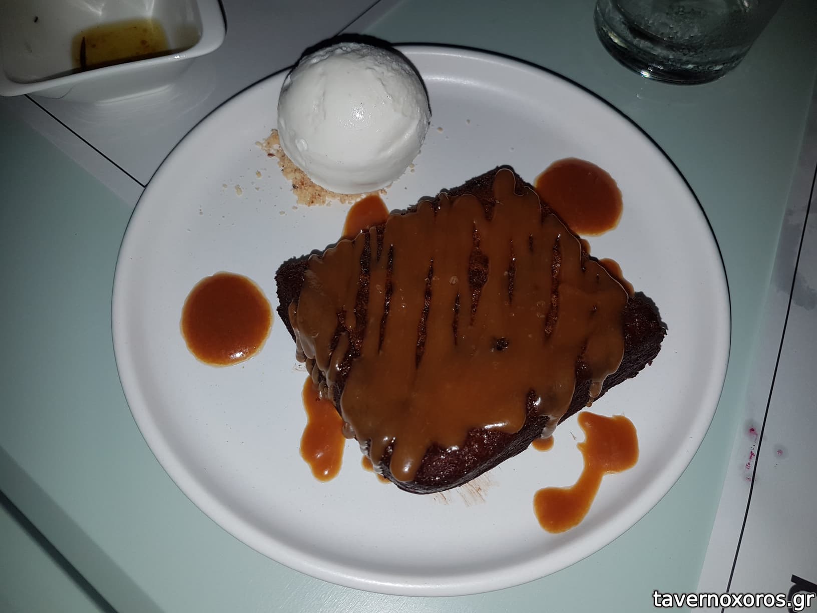 "Σοκολατόπιτα: μαλακό κέικ σοκολάτας ΙΟΝ, χειροποίητη ρευστή καραμέλα βουτύρου, άνθος αλατιού" (καλή)
