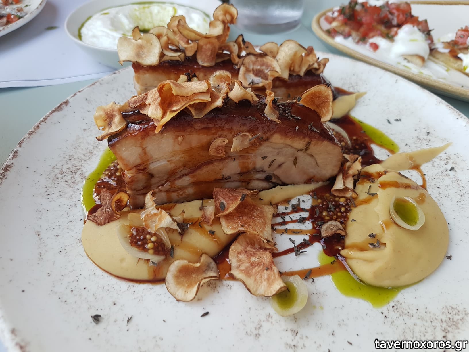 "Χοιρινό: πανσέτα, φάβα, αγγινάρα Ιερουσαλήμ, αλμυρόγλυκη σάλτσα, πίκλα κρεμμύδι" (καλό)