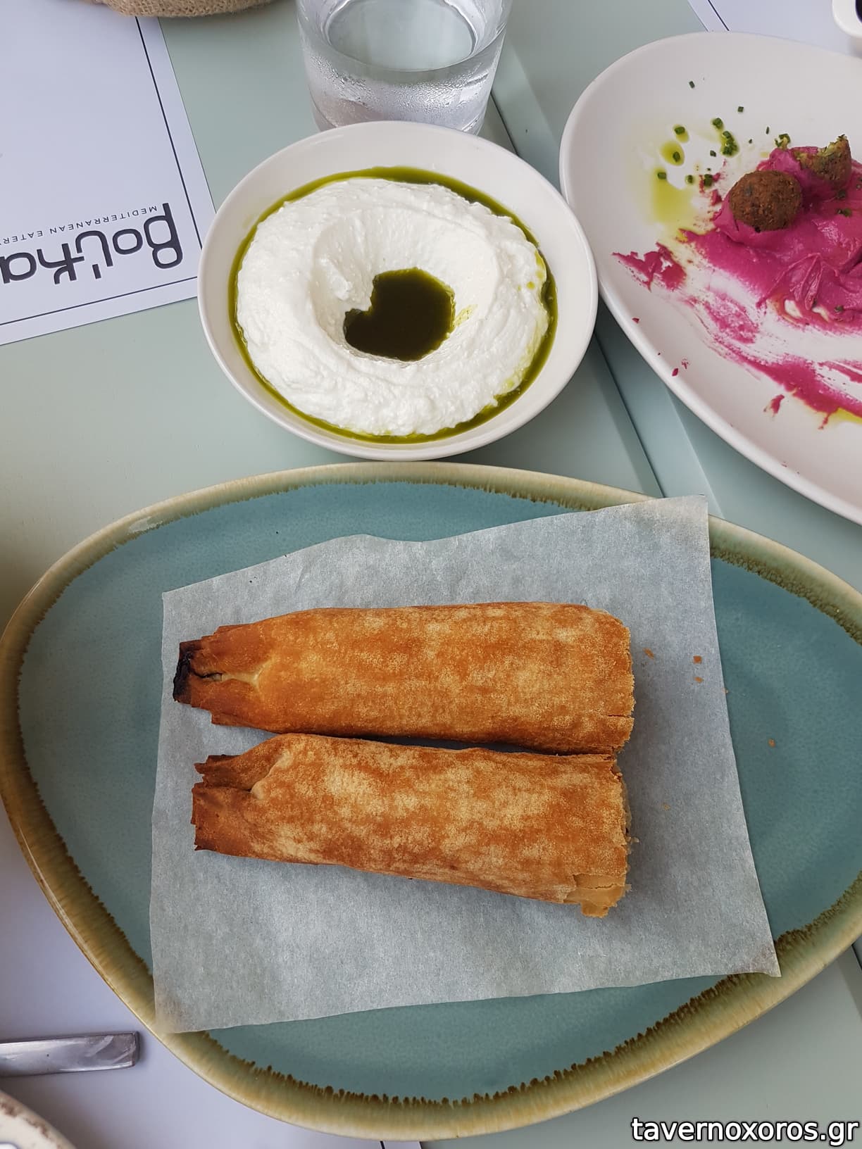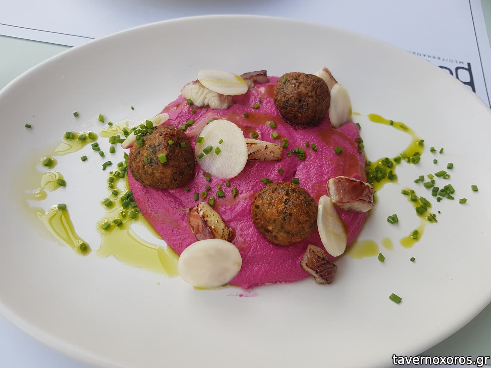 "Χούμους με παντζάρι: ρεβίθια, καπνιστό χέλι Άρτας, ταχίνι, λεμόνι" (πολύ καλό)