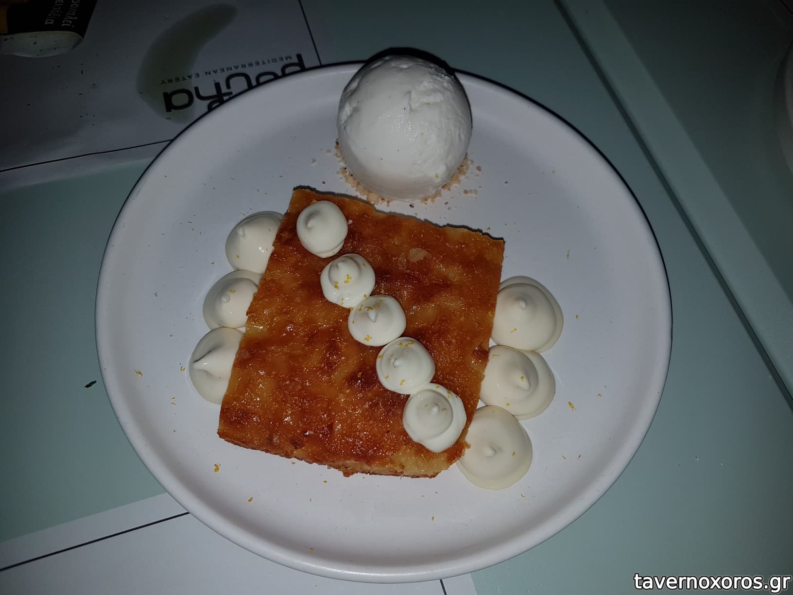 Πορτοκαλόπιτα με τζελ εσπεριδοειδών, ναμελάκα λευκής σοκολάτας και παγωτό βανίλια (εξαιρετική)