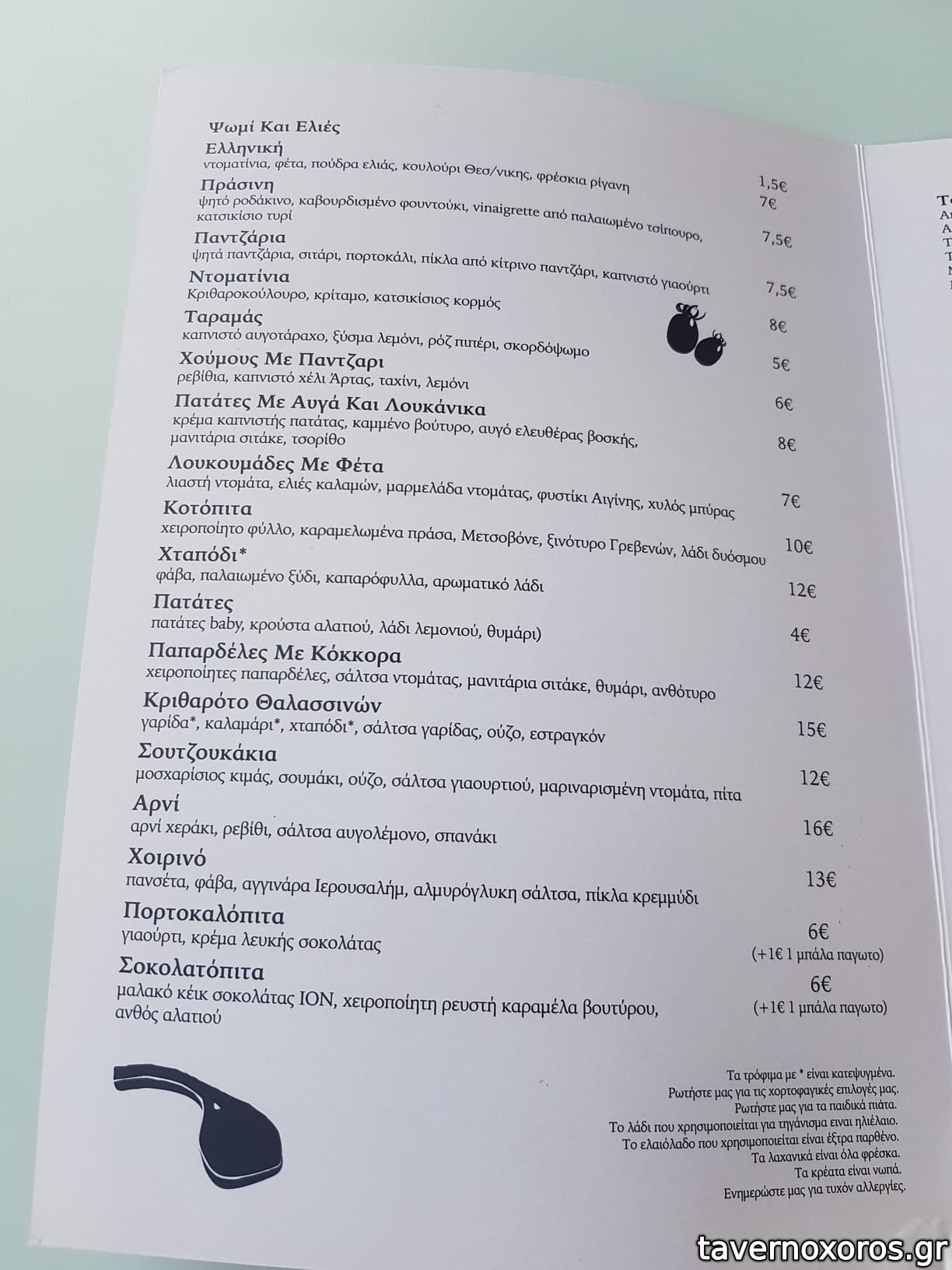"Σουτζουκάκια: μοσχαρίσιος κιμάς, σουμάκι, ούζο, σάλτσα γιαουρτιού, μαριναρισμένη ντομάτα, πίτα" (σφιχτά και στεγνά, όχι του γούστου μου)