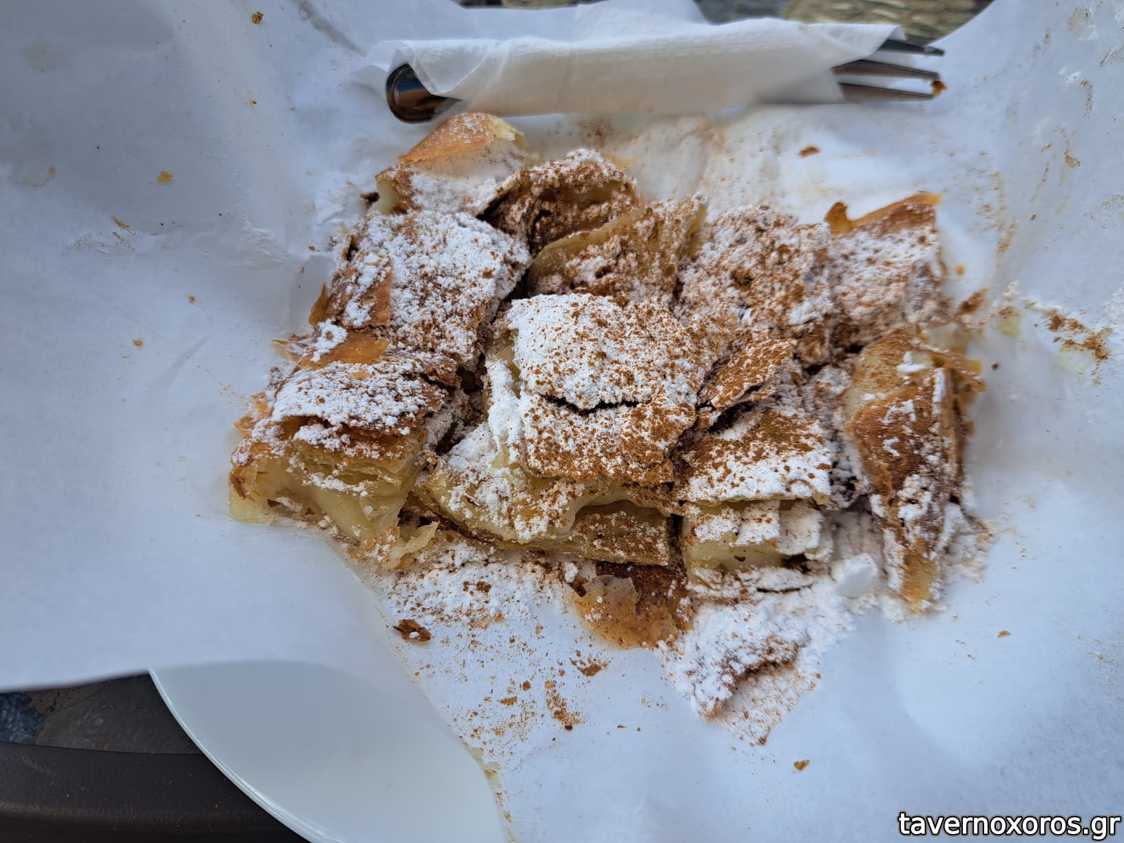 Το φύλλο όχι επαρκώς βουτυρωμενο, αρκετά τραγανό. Η γέμιση κάπως υδαρής, σαν αραιωμένη.